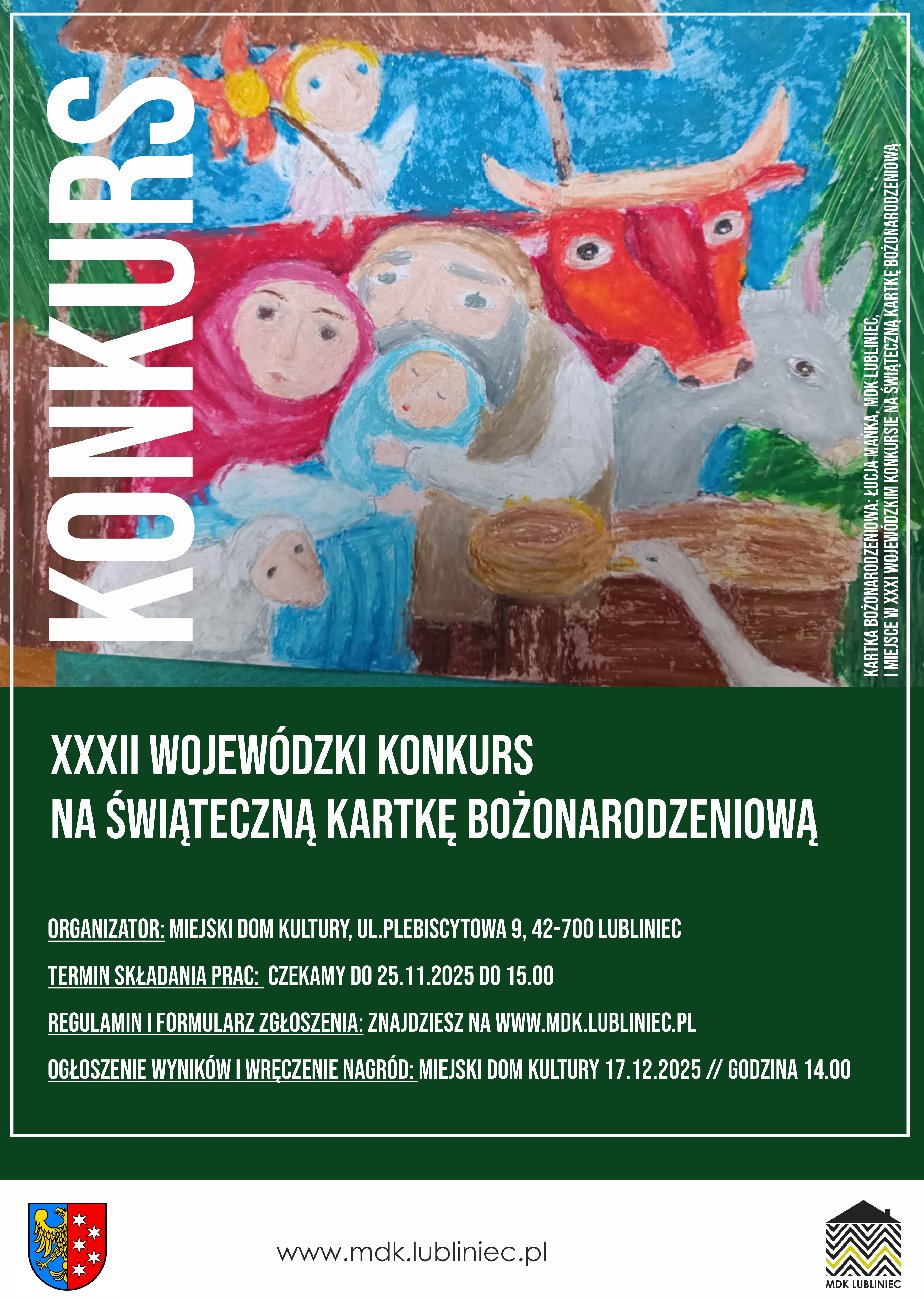 Miejski Dom Kultury w Lublińcu zaprasza do udziału w Wojewódzkim Konkursie Plastycznym - na Świąteczną Kartkę Bożonarodzeniową - w kilku kategoriach wiekowych.