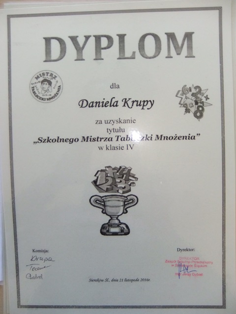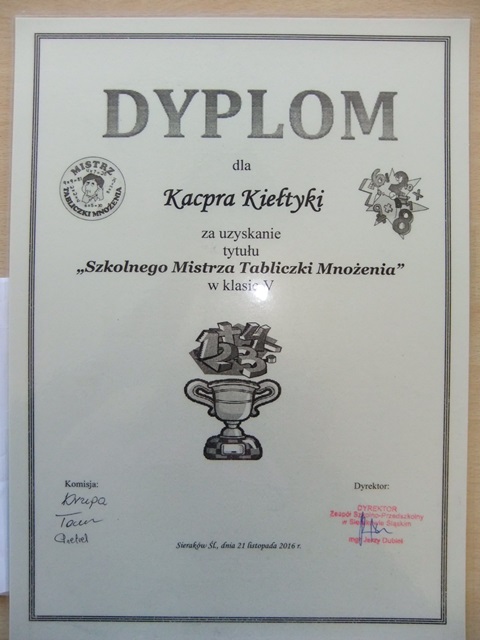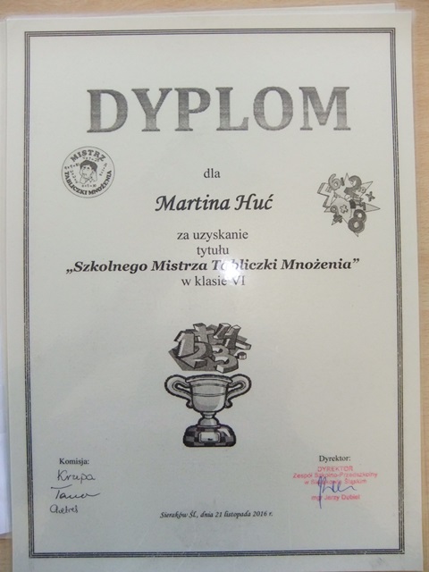 21 listopada odbyło się wręczenie dyplomow i nagród dla Mistrzów Tabliczki Mnożenia! Uczniowie klas IV, V, i VI Szkoły Podstawowej rywalizowali w dwóch konkurencjach. Pierwsza sprawdzała szybkość obliczania: iloczynów, ilorazów. Druga sprawdzała logiczne myślenie.