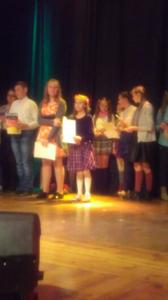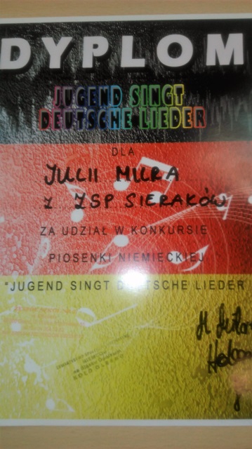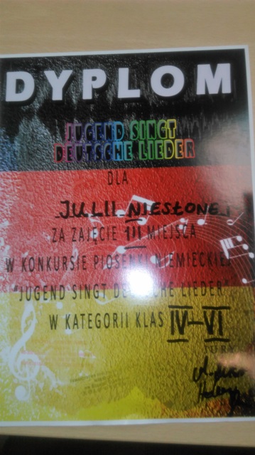 17 listopada 2016 r. nasze dwie uczennice Julia Mura i Julia Niesłony kolejny raz reprezentowały naszą szkołę w konkursie piosenki niemieckiej w Oleśnie. Konkurs "Jugend singt deutsche Lieder" został zorganizowany przez Zespół Szkół nr 2 oraz TSKN w Oleśnie. Możemy z dumą powiedzieć, że nasze uczennice wystąpiły rewelacyjnie. Ich występ był taki jak one, pogodny i radosny. Niestety, jak to na konkursach bywa, nie wszyscy mogą wygrywać, bo miejsca są tylko 3, a chętnych na nie wielu. Z radością możemy powiedzieć, że na miejscu trzecim znalazła się uczennica klasy czwartej Julia Niesłony. Z tego miejsca gratulujemy obu Julkom za ich zaangażowanie i radość jaką nam sprawiły, reprezentując naszą szkołe, a rodzicom za pomoc. Dziękujemy i życzymy dalszych sukcesów.