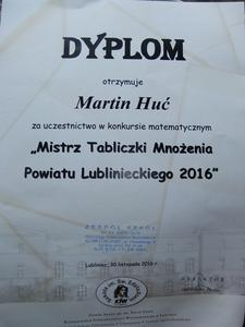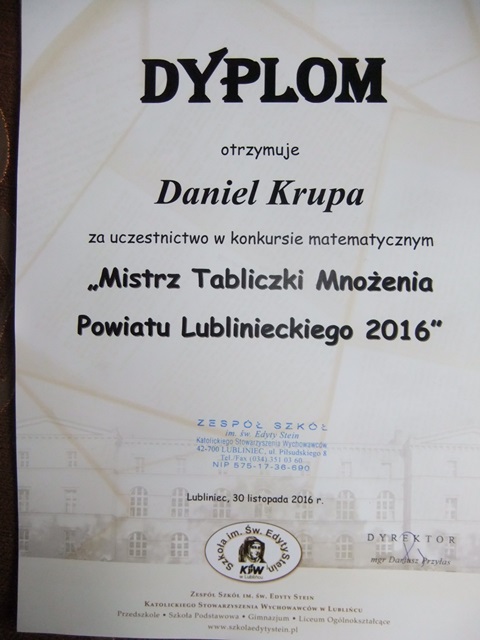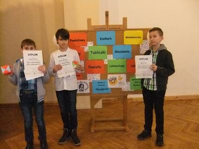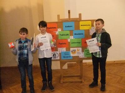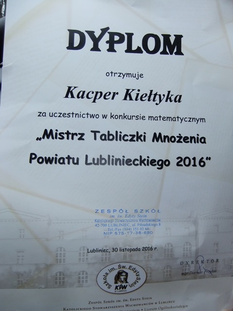 30 listopada Daniel Krupa, Kacper Kiełtyka i Martin Huć reprezentowali naszą szkołę w konkursie "Mistrz Tabliczki Mnożenia Powiatu Lublinieckiego 2016". Chłopcy, mimo że żaden z nich nie uzyskał tytułu mistrzowskiego, osiągnęli wysokie wyniki. Martin uzyskał 93% mozliwych do uzyskania punktów, co pozwoliło mu w nieoficjalnej klasyfikacji uczniów klas szóstych zająć 5 miejsce. Wsród piątoklasistów Kacper zajął 4 miejsce a Daniel wśród czwartoklasistów 3 miejsce. Gratulujemy!!!