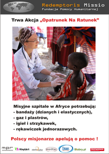 Zapraszamy całą społeczność szkolną do wspólnego włączenia się do Akcji Fundacji Redemptoris Missio „Opatrunek na ratunek”. W naszej szkole będzie ona trwała do dnia 17 marca 2017 roku. Co będziemy zbierać? W misyjnych przychodniach brakuje dosłownie wszystkiego. Każdy bandaż, czy plaster są na wagę złota. Przyda się każdy bandaż (czy to dziany, czy elastyczny) gazy (jałowe i niejałowe), kompresy (jałowe i niejałowe), plastry opatrunkowe, rękawiczki gumowe, wata.