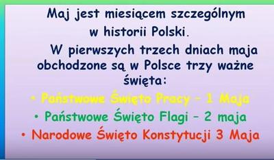 W dniu 28.04.2017 r w Szkole Podstawowej w Sierakowie Śląskim odbył się apel z okazji świąt majowych. Z przedstawionej prezentacji uczniowe dowiedzieli się jakie święta przypadają w początkowych dniach piątego miesiąca roku, co upamiętniają, od kiedy, jak są i jak były obchodzone. Pierwsza cześć dotyczyła 1 maja - Święto Pracy - Międzynarodowy Dzień Solidarności Ludzi Pracy. Druga część przedstawiała 2 maja - Święto Flagi. W trzeciej części ukazano jedno z najważniejszych świąt państwowych - 3 maja - rocznica uchwalenia Konstytucji. Z niej ucznowie dowiedzieli się wielu ciekawych informacji, m. in.: że była to pierwsza w Europie i druga na świecie ustawa zasadnicza.