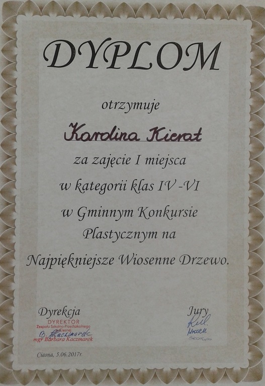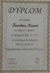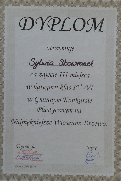 Miło nam poinformać, że w Gminnym Konkursie Plastycznym, na Najpiękniejsze Wiosenne Drzewo, którego organizatorem była Szkoła w Ciasnej, w kategorii klas IV-VI - Pierwsze miejsce zajęła Karolina Kierat, natomiast Trzecie miejsce - Sylwia Skowronek.