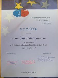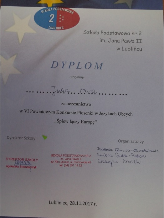Dnia 28.11.2017r. w Szkole Podstawowej nr 2 im. Jana Pawła II w Lublińcu odbył się VI Konkurs Piosenki w Językach Obcych "Śpiew łączy Europę". W tegorocznej edycji uczniowie klas IV-VII mieli zaprezentować piosenkę filmową. Naszą szkołę reprezentowały: Julia Niesłony (kl. V) wykonując piosenkę "Let it go" z filmu Frozen oraz Jullia Mura (kl. VI) z piosenką "When there was me and you" z filmu High School Musical. Dziewczyny wykonały piosenki w języku angielskim.
