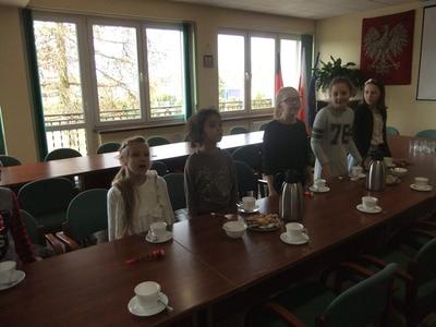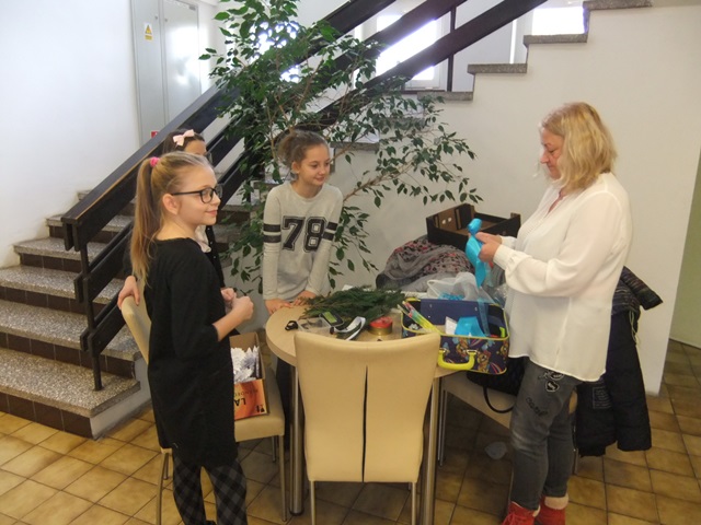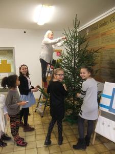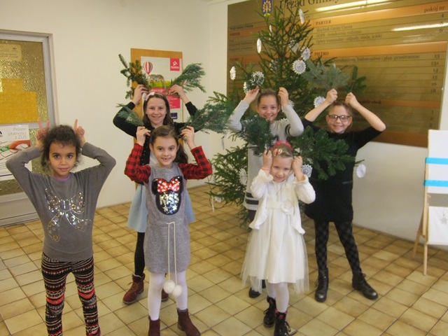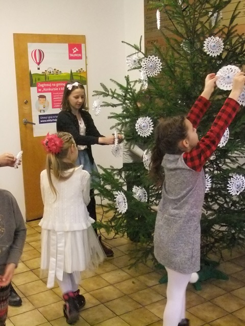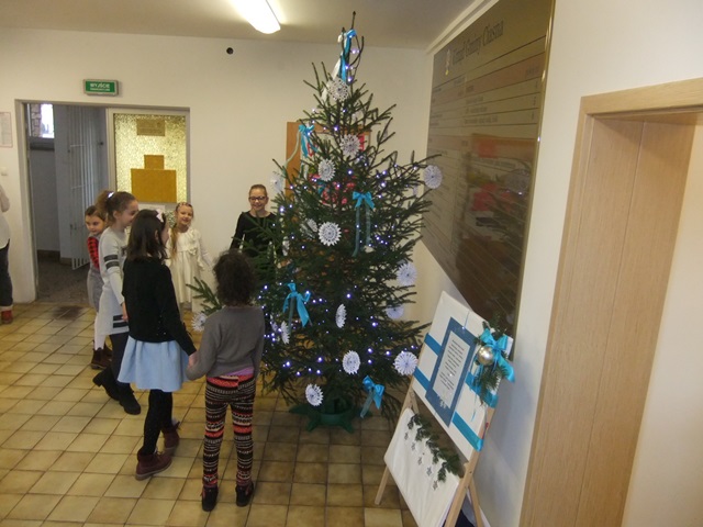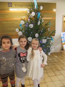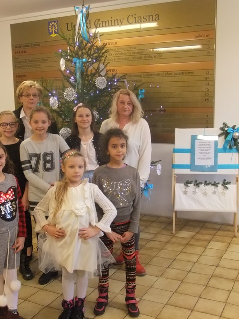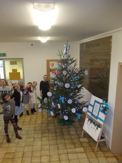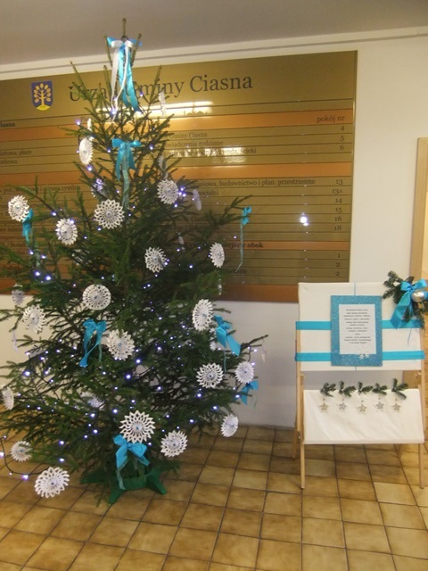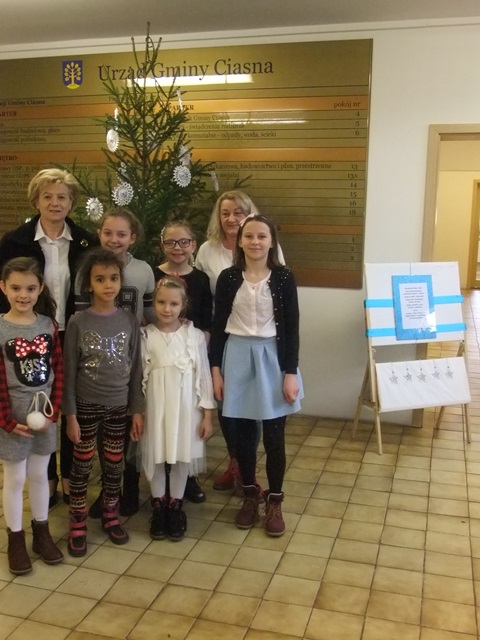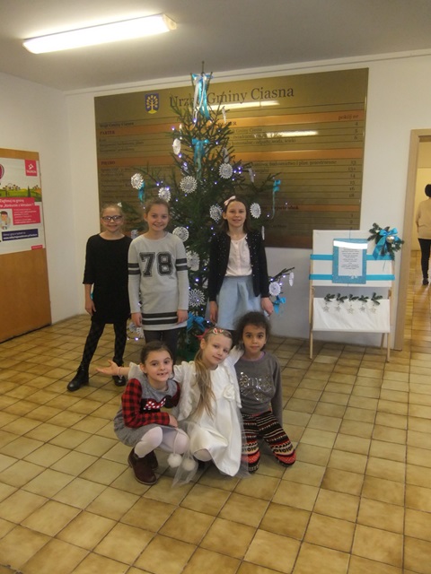 14 grudnia na zaproszenie pani Sekretarz Albiny Pagoda grupa uczennic z naszej szkoły udała się do Urzędu Gminy w Ciasnej. Powodem ich wizyty była świąteczna misja związana z przygotowaniem dekoracji bożonarodzeniowej choinki ustawionej w holu Urzędu. Wcześniej uczniowie na zajęciach plastycznych pieczołowicie wycinali śnieżynki, które stanowiły podstawę tegorocznej dekoracji. Świąteczna atmosfera szybko udzieliła się dziewczynkom i nucąc piosenkę o Mikołaju, czym wywołały uśmiech na twarzach petentów odwiedzających w tym dniu Urząd, udekorowały drzewko. Miłym akcentem było spotkanie z panią Sekretarz przy gorącej herbatce i tradycyjnym pierniku. Mamy nadzieję, że choinka naszego autorstwa umili pobyt w urzędzie mieszkańcom naszej gminy.