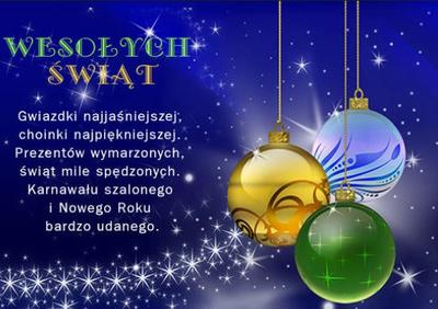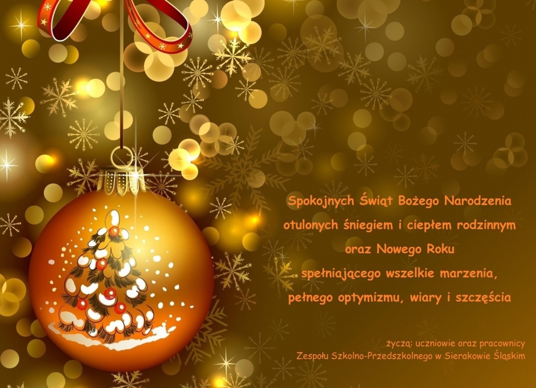 ŻYCZENIA ŚWIĄTECZNE Spokojnych Świąt Bożego Narodzenia otulonych śniegiem i ciepłem rodzinnym oraz Nowego Roku spełniającego wszelkie marzenia, pełnego optymizmu, wiary i szczęścia życzą uczniowie oraz pracownicy Zespołu Szkolno-Przedszkolnego w Sierakowie Śląskim Zdjęcia Zobacz również CHOINKA JUŻ BŁYSZCZY KALENDARZ ADWENTOWY SPOTKANIA WIGILIJNE ŻYCZENIA ŚWIĄTECZNE ZAPRASZAMY NA BAL KONKURS- RYMOWANKA O ZDROWYM JEDZENIU 21 grudnia 2017 Aktualności Wydrukuj Udostępnij Wyświetlono: 651