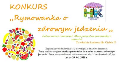 Zapraszamy do udziału w konkursie "Rymowanka o zdrowym jedzeniu" dla kl. 1-3 Lubisz owoce i warzywa? Masz pomysł na rymowankę o zdrowym jedzeniu? To właśnie konkurs dla Ciebie !!! Pracą konkursową jest krótka rymowanka do 6 zdań na temat zdrowego jedzenia. Prace należy oddawać wychowawcom klas 1-3 na kartkach A5 lub A4 do dnia 20 stycznia 2018 r.