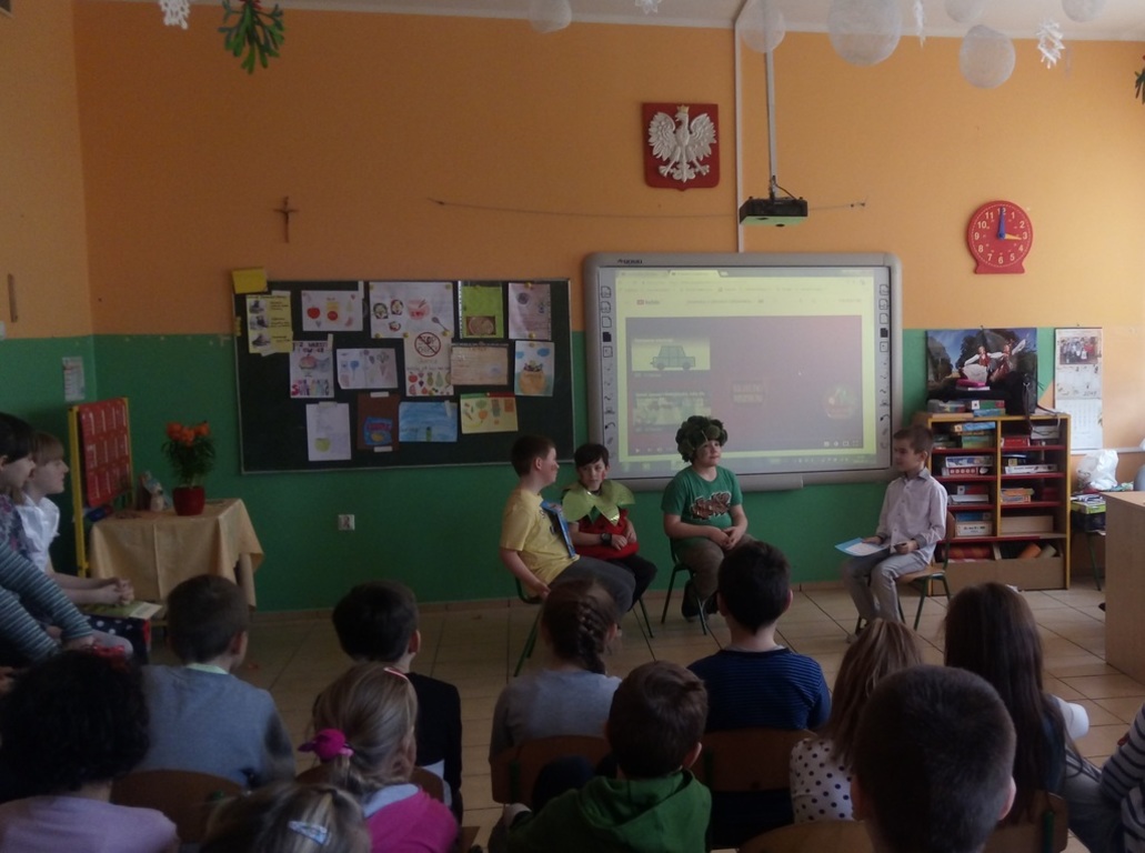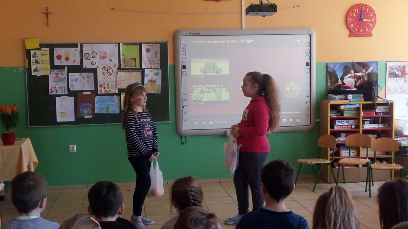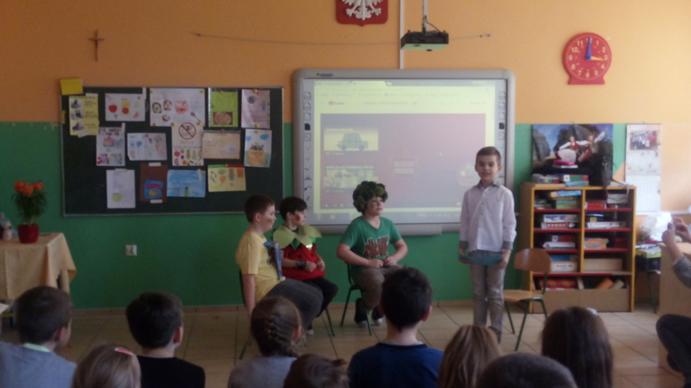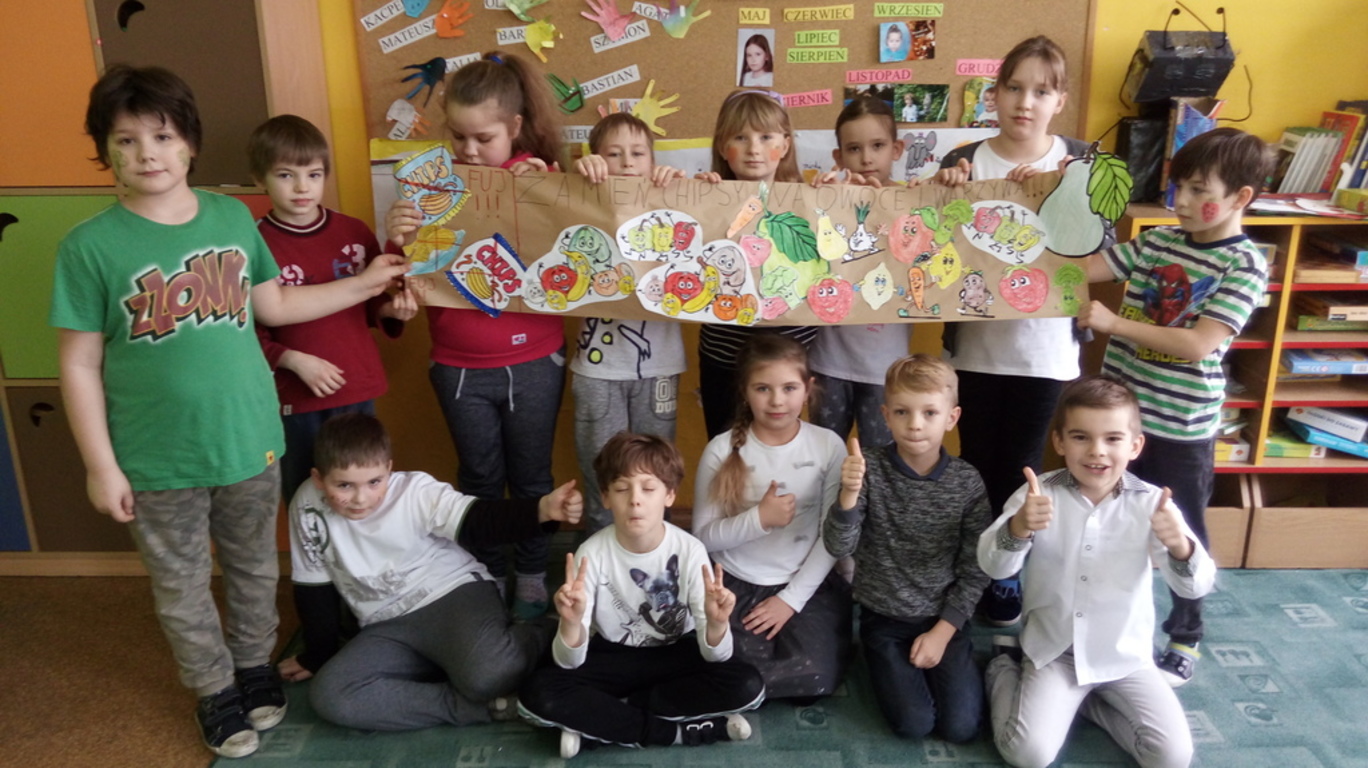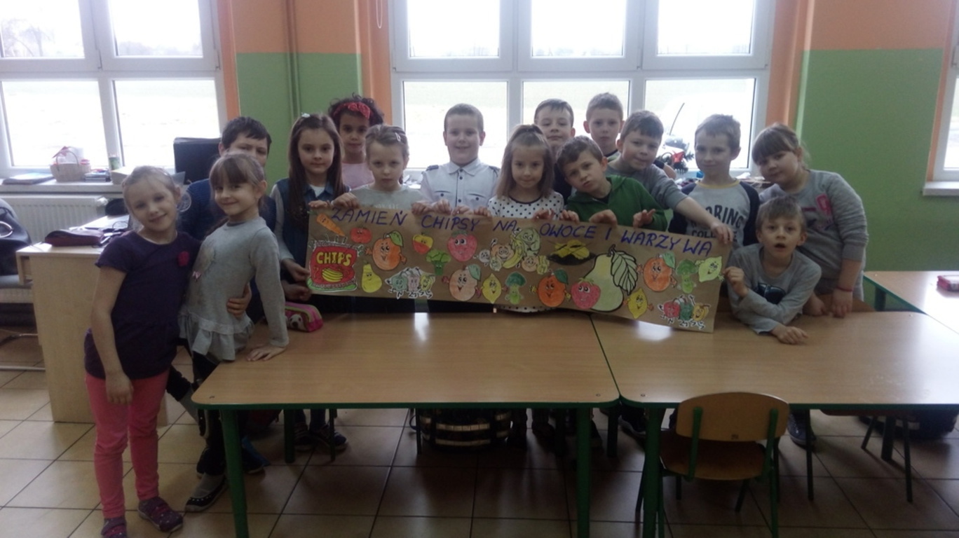 15. 03. 2018 r. w klasach I - III została zrealizowana akcja "Zamień chipsy na owoce i warzywa" w ramach szkolnego projektu Żyjmy kolorowo – aktywnie i zdrowo. Akcja została przygotowana właśnie po to, aby pokazać uczniom zalety świadomego odżywiania się, nauczyć ich dokonywać wyboru między tym, co zdrowe i odżywcze, a szkodliwe, choć smaczne. Poza tym chcemy, aby dzieci rozumiały, że żyć zdrowo, to również znaczy spożywać zdrowe, ekologiczne, wartościowe pokarmy. W ramach akcji klasa 3 b wzięła udział w klasowym konkursie plastycznym "Zamień chipsy na owoce" i przygotowała krótkie przedstawienie wskazujące na wady niezdrowych produktów. Uczniowie klas 1-3 wspólnie śpiewali owocowe piosenki oraz wykonali plakat promujący akcję. Poprzez zabawę dzieci poszerzyły swoją wiedzę na temat zdrowego sposobu odżywiania.