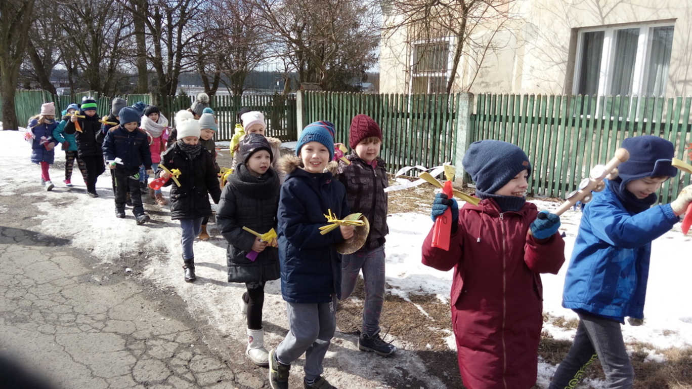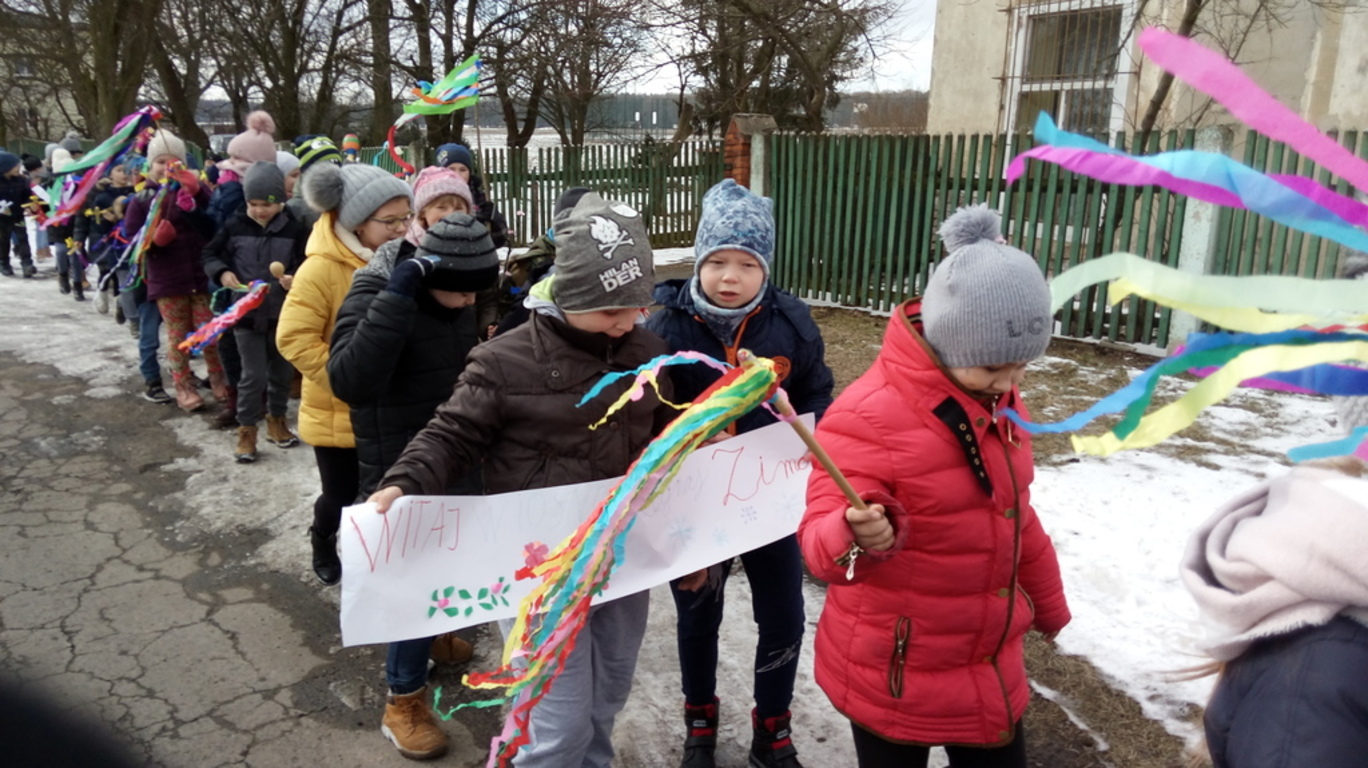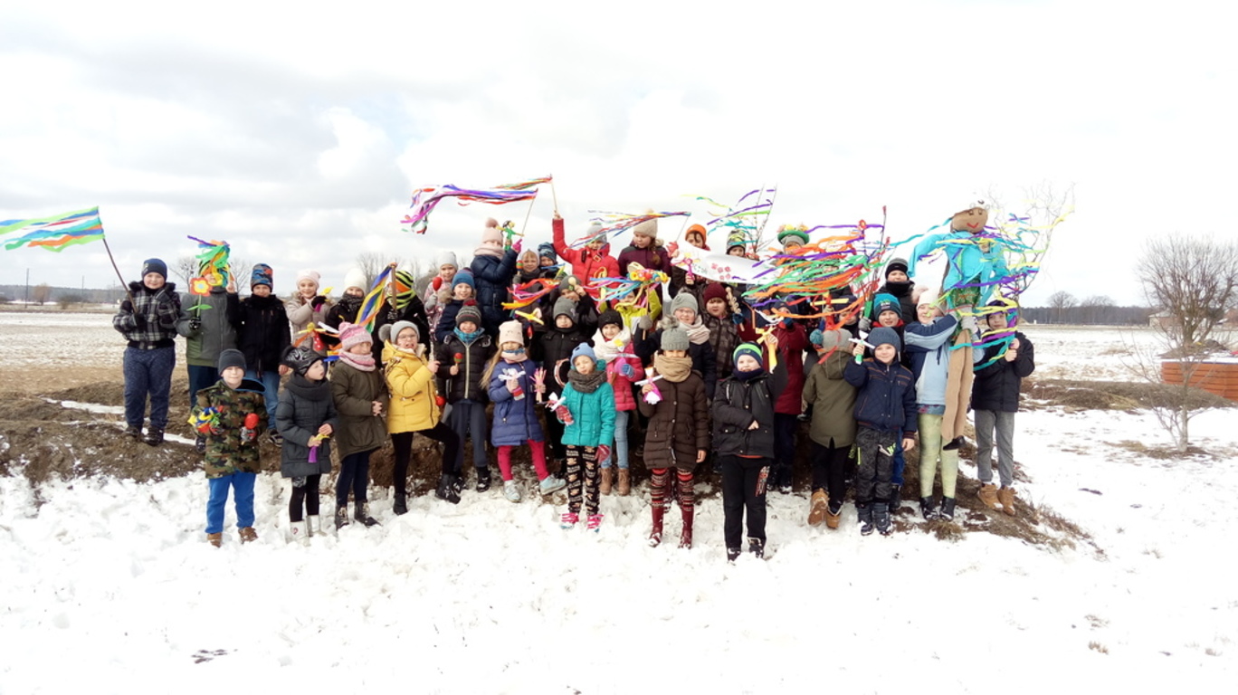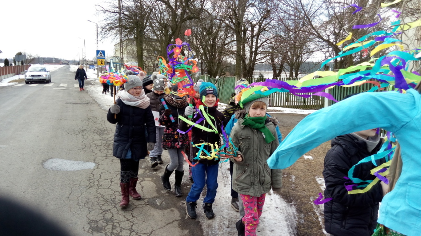 21 marca uczniowie radośnie powitali wiosnę. Z tej okazji dzieci wykonały kolorowe gaiki oraz przygotowały wiosenne okrzyki i piosenki. Uczniowie klas I-III wyruszyli w barwnym korowodzie przez wieś, podczas którego mogli pożegnać zimę i powitać wiosnę. Dzieci dumnie niosły symbol zimy – kolorową Marzannę, którą następnie pożegnały w tradycyjny sposób.