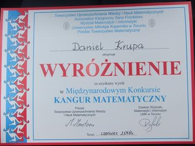 Daniel Krupa z klasy V otrzymał wyróżnienie