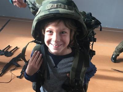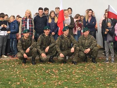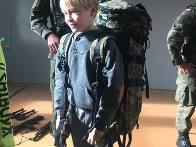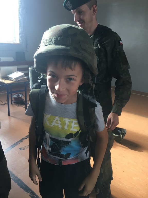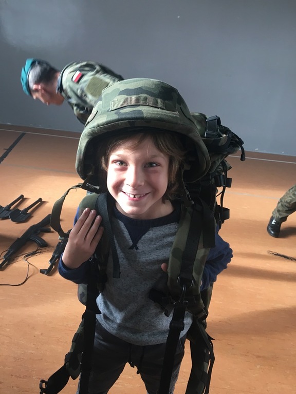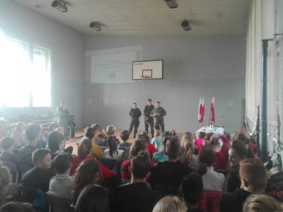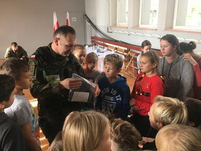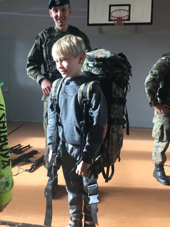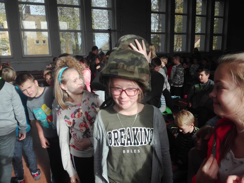 26. października daliśmy naszym uczniom kolejną szansę na poznanie ciekawego zawodu. Tego dnia z inicjatywy Pani Michaliny Janik gościliśmy w naszej szkole żołnierzy z jednej z opolskich jednostek wojskowych. Przywitanie dzieci z żołnierzami odbyło się w dość nietypowy sposób, gdyż nasi uczniowie według rozkazu wojskowych w ciągu trzech minut mieli wyjść z sali i znaleźć się na placu przed budynkiem szkoły. Tam każda z klas ustawiona w kolumny została poinstruowana przez dowódcę jak wyglądać powinna musztra wojskowa. Z budynku szkoły przeszliśmy na halę sportową gdzie obyła się kolejna część spotkania. Pan Chorąży przedstawił uczniom jakie wymagania należy spełnić aby zostać żołnierzem, podkreślając, że dobre oceny są szczególnie ważne, jak wygląda codzienna praca w wojsku oraz dlaczego zawód ten jest tak ważny i istotny w dzisiejszych czasach. Po krótkiej prelekcji dzieci miały szansę zapoznać się ze sprzętem wojskowym. Przymierzali hełmy, zakładali plecaki z pełnym wyposażaniem, które niejednokrotnie ich przeważały, a także mieli okazję spróbować jedzenia jakie mają przy sobie żołnierze będąc na misjach. Na koniec nasi goście uświadomili nam, że to wszystko co robią i kim są jest możliwe tylko dzięki temu, że od 100 lat jesteśmy krajem wolnym i niepodległym. Chcąc uczcić zbliżającą się rocznicę odzyskania Niepodległości wróciliśmy do szkoły niosąc biało – czerwone flagi.