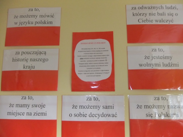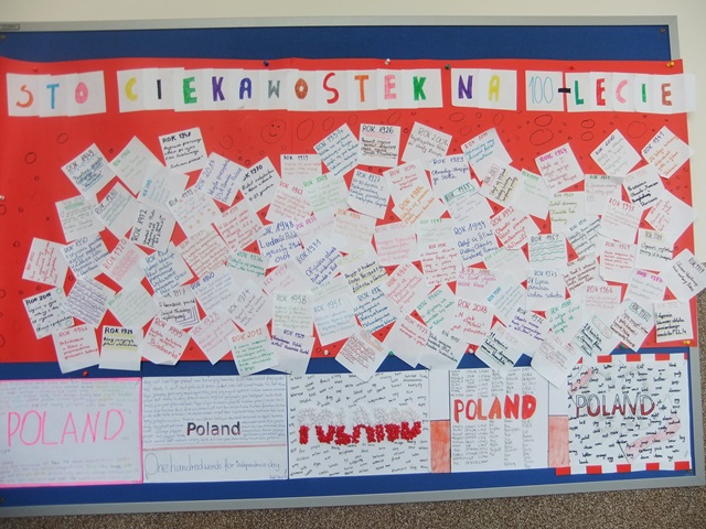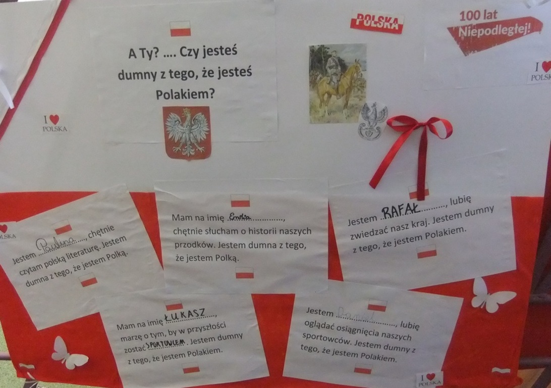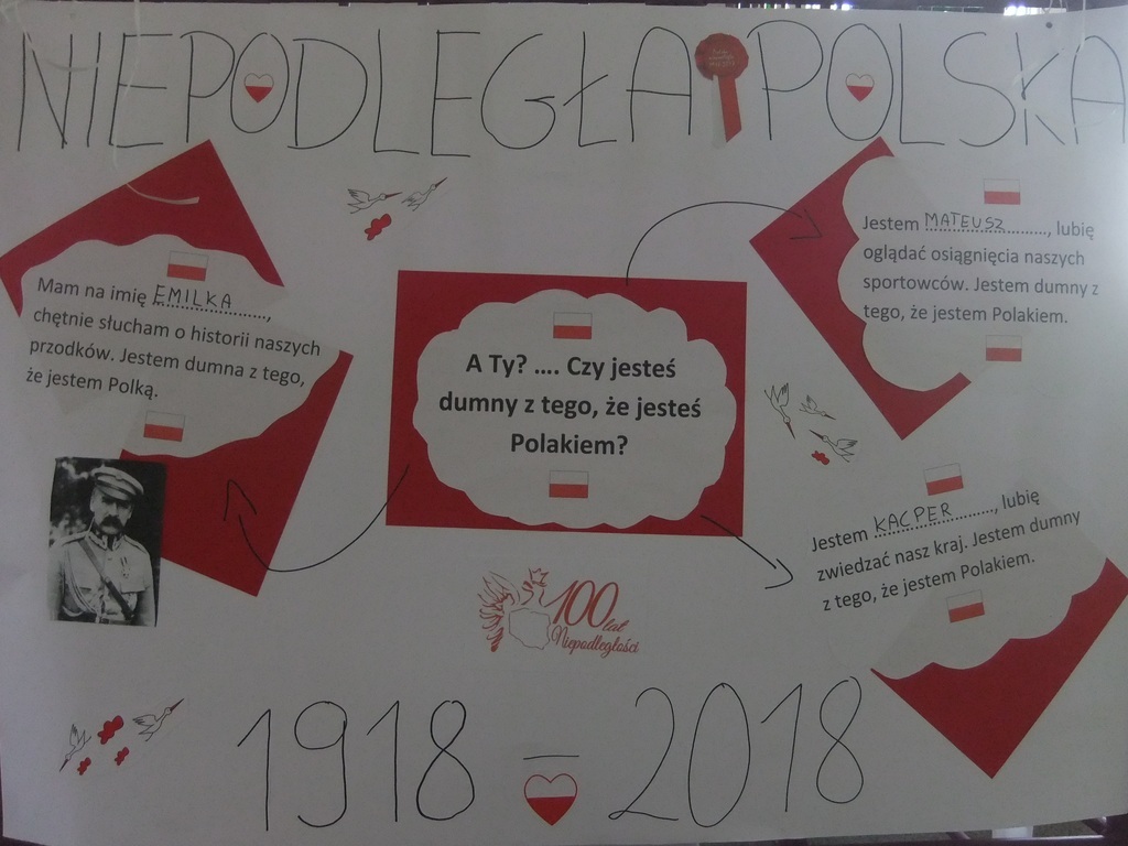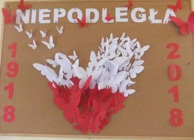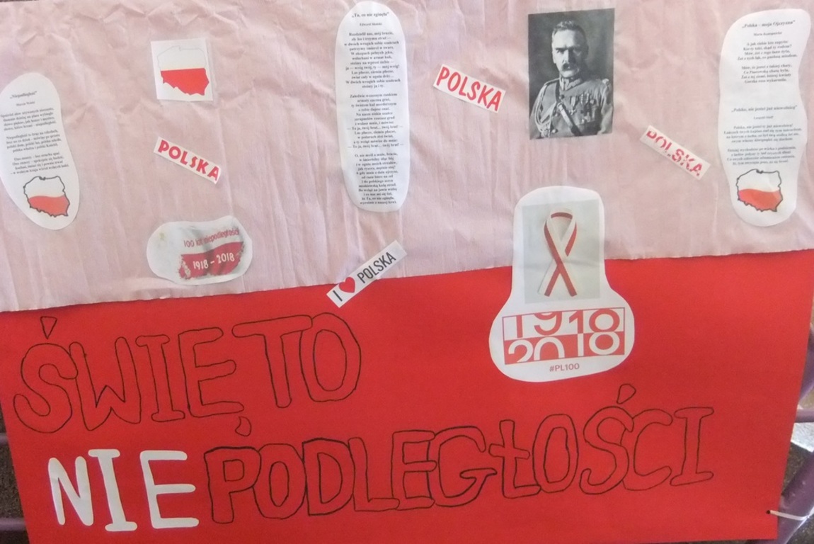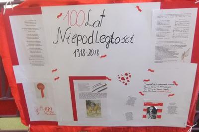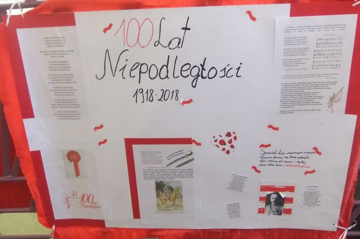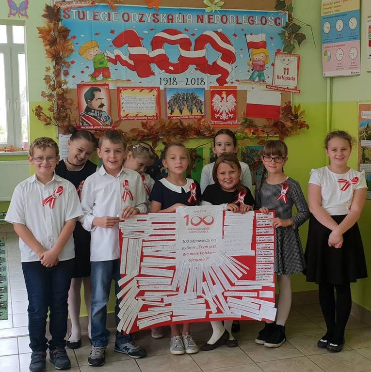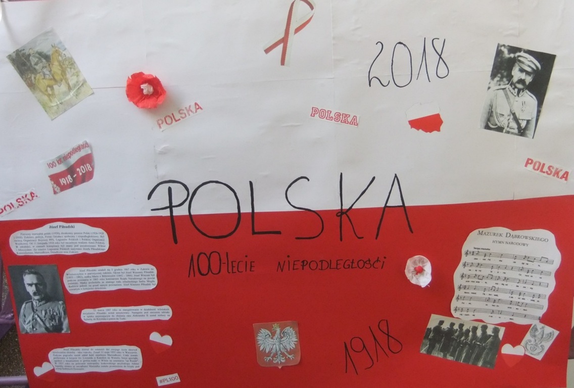 11 listopada 1918 roku po 123 latach niewoli Polska odzyskała niepodległość. Dzień ten należy do najradośniejszych w dziejach narodu polskiego. Na placach i ulicach gromadziły się tłumy ludzi, śpiewając pieśni patriotyczne, wiwatując na widok polskich flag i pierwszych polskich żołnierzy. Spontanicznie usuwano obce symbole, a młodzi ludzie masowo wstępowali do tworzącego się Wojska Polskiego. Wydarzenia związane z tym jubileuszem organizowane są w całej Polsce. Również nasza Szkoła czynnie włączyła się w te obchody podejmując wiele inicjatyw dla jej uczczenia, a 9 listopada odbyła się uroczysta akademia.