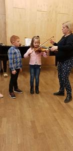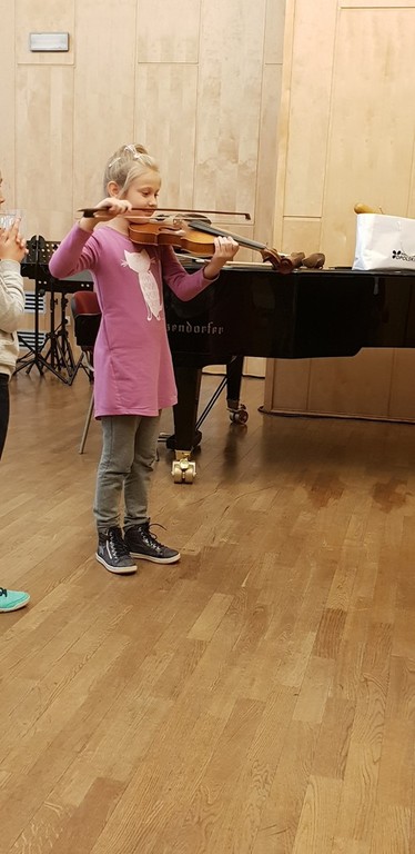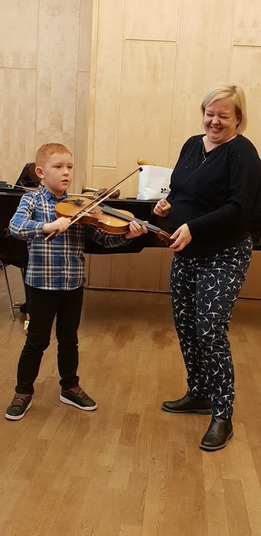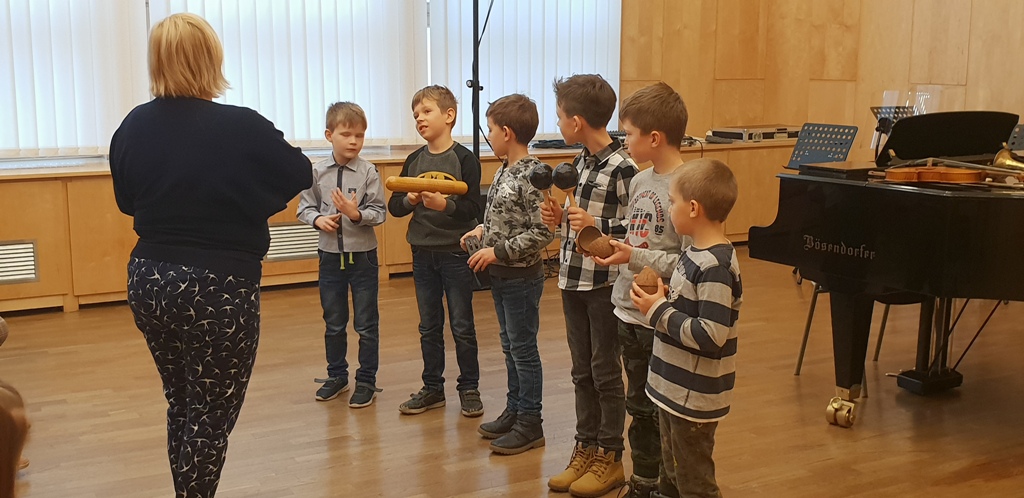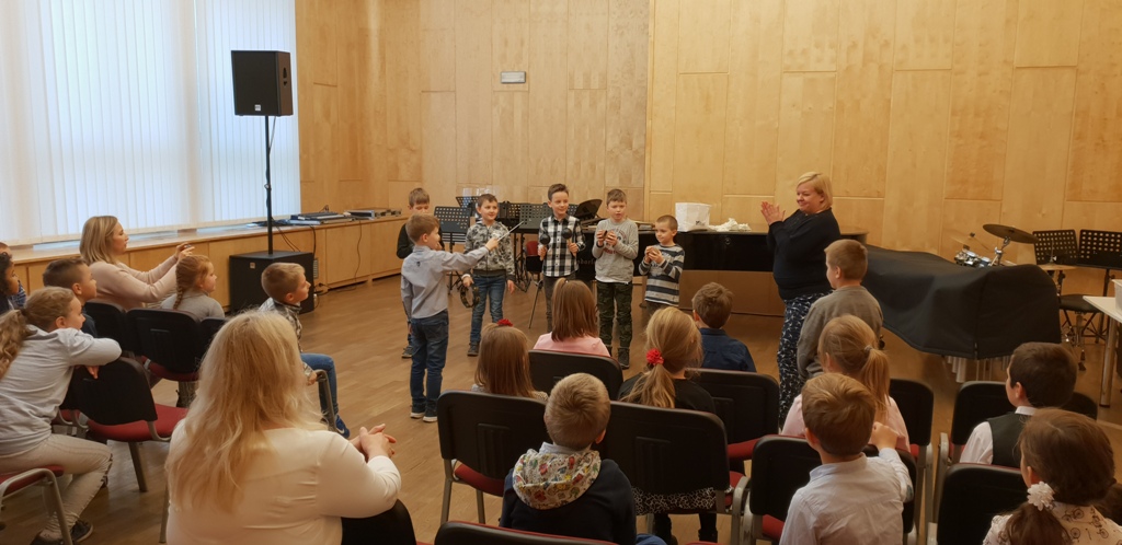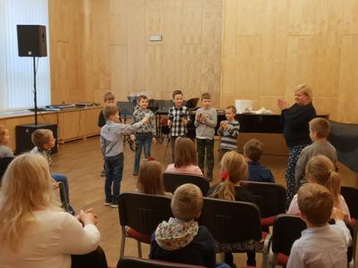 W ramach lekcji odbyła się prezentacja wybranych instrumentów, pogadanka o muzyce, a także gry i zabawy muzyczne. Uczyliśmy się gry na trąbce, skrzypkach, a nawet dyrygować orkiestrą.