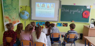 Dzień Jogurtu pod hasłem - „JOGURT NA DOBRY DZIEŃ” – podczas tego dnia uczniowie wysłuchali pogadanki na temat pochodzenia i walorów zdrowotnych jogurtu w codziennej diecie. Dzieci wysłuchały i obejrzały prezentację "Czy warto jeść jogurty?". Analizowali skład. Dowiedziały się między innymi tego, że każdy jogurt zawiera w sobie mnóstwo dobrych bakterii, których łacińskie nazwy są bardzo trudne do wymówienia. Nazywają się tak "mądrze" zapewne dlatego, że w niesamowicie inteligentny sposób chronią nas przed przeziębieniem. Wszyscy mogli też nauczyć się jak przygotować z jogurtu naturalnego zdrowy, pełnowartościowy posiłek mleczny.