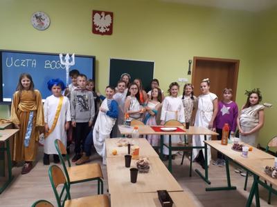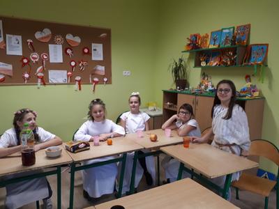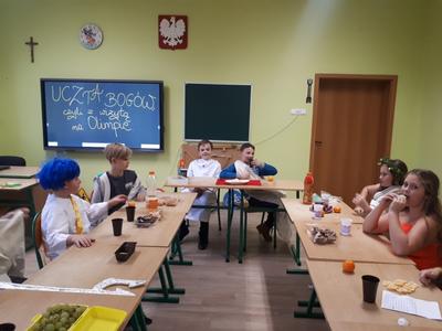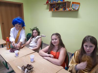 21 listopada klasa 5b - w ramach podsumowania dotychczasowych lekcji z mitologii - przygotowała ucztę bogów greckich. Na spotkanie przybyli Zeus, Posejdon, Hades, Atena, Amfitryta, Artemida, Persefona...i wielu innych greckich gości - prosto z Olimpu. Wszyscy w pięknych strojach i greckich stylizacjach z odpowiednimi atrybutami. Podczas uczty spożywali nektar i ambrozję, czyli wszystko to, co bogowie lubili najbardziej. Klasa zamieniła się w komnatę, niczym z pałacu Zeusa, a stoły były pełne pyszności. Uczniowie dokładnie przedstawili bohaterów, których postać postanowili przybrać. Dziękujemy wszystkim za zaangażowanie, odpowiednie przygotowanie i czekamy na kolejne "ciekawe spotkanie" w czasie lekcji.