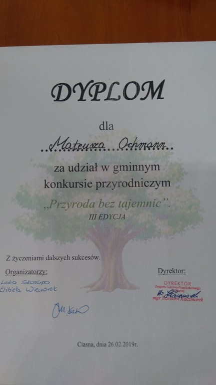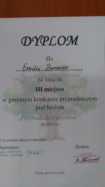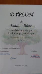26 lutego Natalia Niesłony, Emilia Borowicz oraz Mateusz Ochmann wzięli udział w gminnym konkursie wiedzy przyrodniczej dla uczniów klas I-III, którego organizatorem była szkoła filialna w Glinicy. Celem konkursu było rozbudzenie zainteresowania o otaczającym środowisku naturalnym, zdobywanie i pogłębianie wiadomości o lesie jego mieszkańcach i darach lasu, propagowanie ekologicznego stylu życia, wzbudzanie motywacji do działania na rzecz ochrony środowiska przyrodniczego. Uczniowie rozwiązywali test składający się z 21 pytań z szeroko rozumianej wiedzy przyrodniczej. Uczennica klasy trzeciej, Emilia Borowicz, zdobyła III miejsce. Wszystkim serdecznie gratulujemy i życzymy dalszych sukcesów.