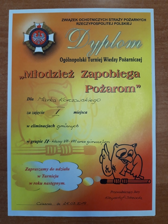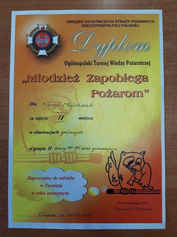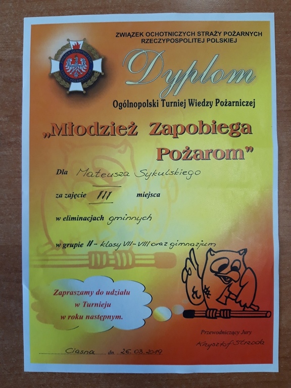 26 marca uczniowie naszej szkoły wzięli udział w gminnym konkursie wiedzy pożarniczej „Młodzież zapobiega pożarom”, który odbył się w budynku Urzędu Gminy w Ciasnej. Uczniowie rozwiązywali test dotyczący szeroko pojętej wiedzy pożarniczej. Trójka naszych uczniów zajęła czołowe miejsca w kategorii klas VII , VIII oraz gimnazjum.