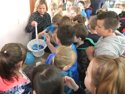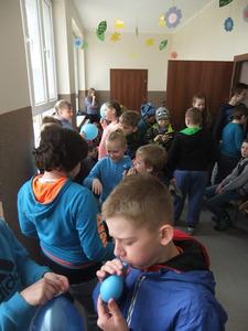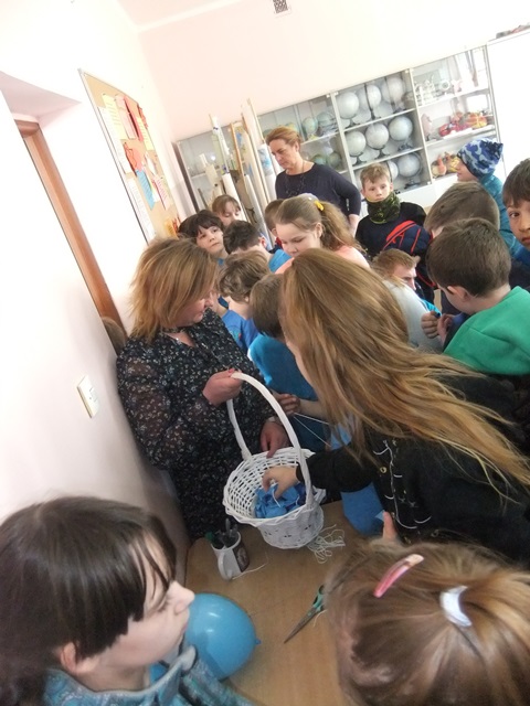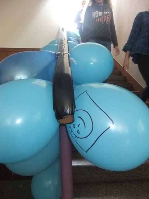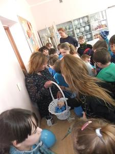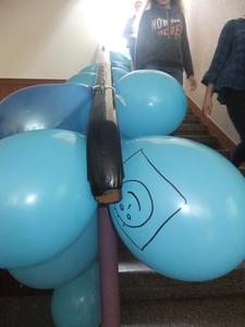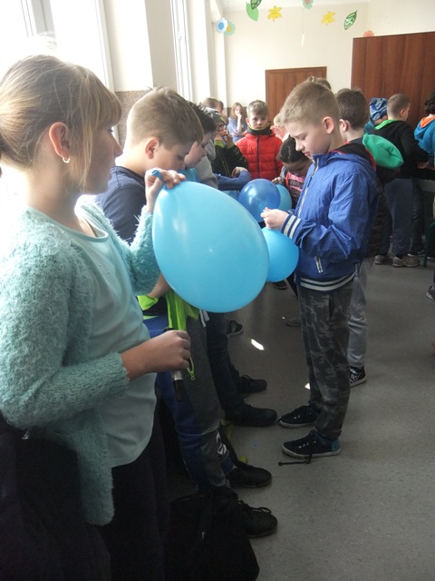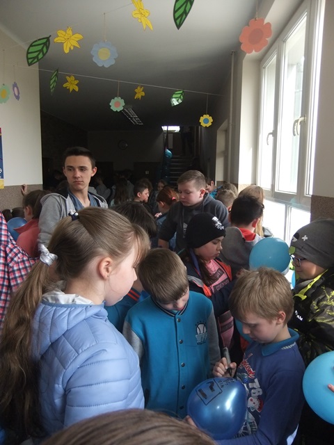 Drugie zadanie dotyczyło nadmuchania niebieskich balonów oraz narysowanie na nich własnego PIKTOGRAMU- czyli małego obrazka dzięki którym niewerbalnie porozumiewa się osoba z autyzmem. Nadmuchane balony z przekazem zostały zawieszone na poręczy schodów w naszej szkole.