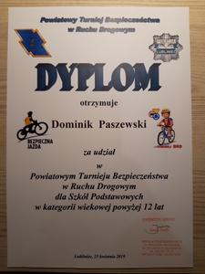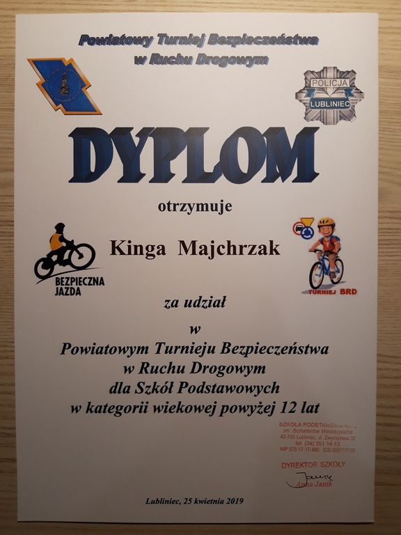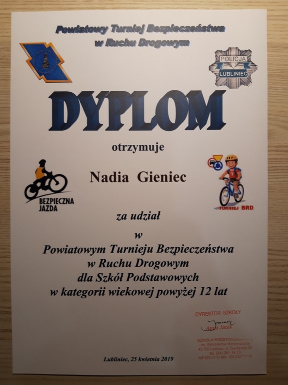 25 kwietnia 2019r w Szkole Podstawowej nr 3 w Lublińcu odbył się Powiatowy Turniej Bezpieczeństwa w Ruchu Drogowym. W kategorii wiekowej powyżej 12 lat naszą Szkołę reprezentowali Kinga Majchrzak i Nadia Gieniec z klasy 7 oraz Dominik Paszewski z klasy 8a. Nasi uczniowie po zaciętych rywalizacjach powrócili z dyplomami i wiedzą, która jest niezbędna, do zachowania bezpieczeństwa w ruchu drogowym.