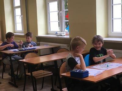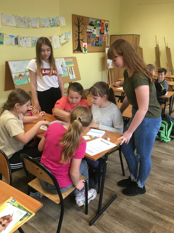 - Klasa VII na lekcji geografii projektowała plakaty i grę planszową o tematyce związanej z efektem cieplarnianym. Uczennice, które wykonałay najciekawszą grę czyli Kinga Majchrzak i Nadia Gieniec, przeprowadziły lekcję z jej wykorzystaniem w klasie IV.