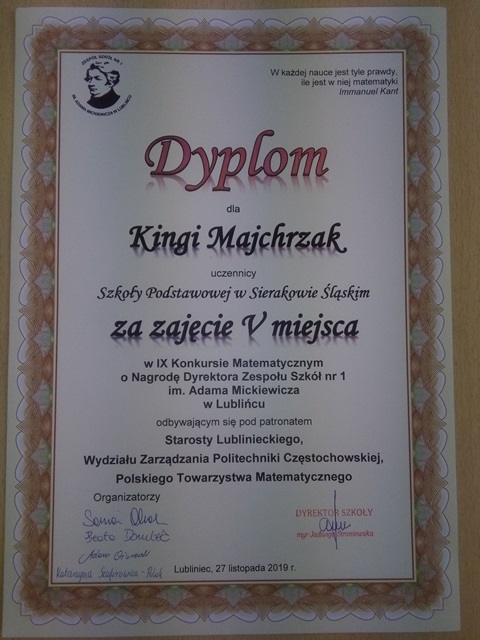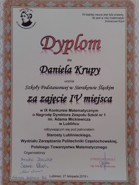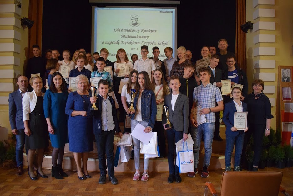 27 listopada 2019 roku w Zespole Szkól nr 1 im. Adama Mickiewicza w Lublińcu już po raz 9 odbył się Powiatowy Konkurs Matematyczny dla Szkół Podstawowych o Nagrodę Dyrektora Zespołu Szkół nr 1 im. A. Mickiewicza. Najwyższe – I miejsce – w matematycznych zmaganiach zapewnił sobie Karol Kardas – uczeń klasy 7 Szkoły Podstawowej im. Karola Miarki w Kochanowicach, zdobywając 37 na 45 punktów. Na II miejscu uplasowała się Julia Kierat ze Szkoły Podstawowej nr 2 im. Jana Pawła II w Lublińcu, a Bartłomiej Śleziona, również ze Szkoły Podstawowej im. Karola Miarki w Kochanowicach, zajął III miejsce. Na IV miejscu znalazł się Daniel Krupa, a na V – Kinga Majchrzak, uczniowie naszej Szkoły Podstawowej w Sierakowie Śląskim. Należy dodać, że zaproszenie na konkurs przyjęło aż 8 szkół podstawowych z całego powiatu. A były to: SP nr 4 im. 74 Górnośląskiego Pułku Piechoty w Lublińcu, SP nr 2 im. Jana Pawła II w Lublińcu, SP im. Karola Miarki w Kochanowicach, SP im. Jana Pawła II w Koszęcinie, SP im. Juliana Tuwima w Lisowie, SP im. Mikołaja Kopernika w Olszynie, SP im. Juliusza Słowackiego w Herbach, SP w Sierakowie Śląskim. Patronat nad konkursem objęli: Starosta Lubliniecki, Polskie Towarzystwo Matematyczne oraz Wydział Zarządzania Politechniki Częstochowskiej, reprezentowany przez dr Anetę Włodarczyk i mgr Agnieszkę Nogę z Katedry Ekonometrii i Statystyki, które po części konkursowej, wygłosiły dla uczniów wykład na temat „Matematyczne modele pomiaru ryzyka inwestycyjnego”. Dziękujemy wszystkim gościom i uczestnikom konkursu. Dziękujemy pracownikom naukowym Politechniki Częstochowskiej, że po raz kolejny przyjęli zaproszenie na nasz konkurs. Uczniom gratulujemy wspaniałych wyników, nauczycielom gratulujemy zdolnych uczniów i dziękujemy, że pielęgnują w nich pasję do matematyki. |