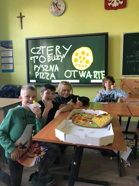Welcome to our pizzeria - tym tematem zajęć klasy piąte rozpoczęły przygotowania do otwarcia swych pizzerii, w których przez znamienitych kucharzy przygotowane zostały przepyszne pizze, zaserwowane przez dostojnych kelnerów i szefów kuchni. Zagraniczni goście bez problemu potrafili porozumieć się w języku angielskim w tych restauracjach zamawiając dania i napoje z interesujących menu, a obsługa restauracji służyła pomocą polecając najlepsze potrawy z zachowaniem zasad savoir vivre.