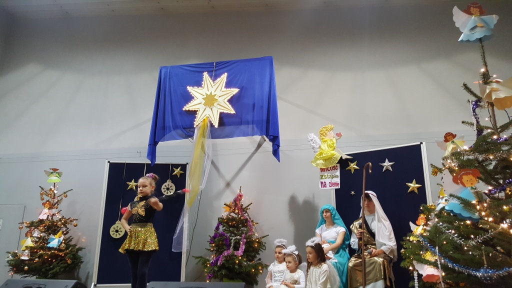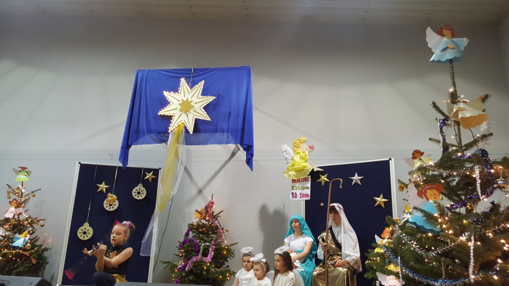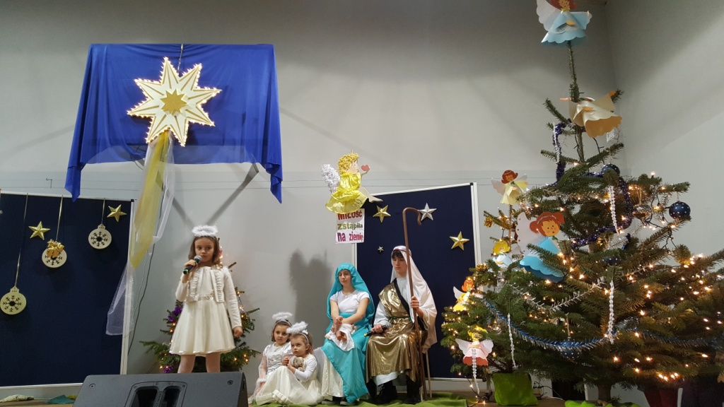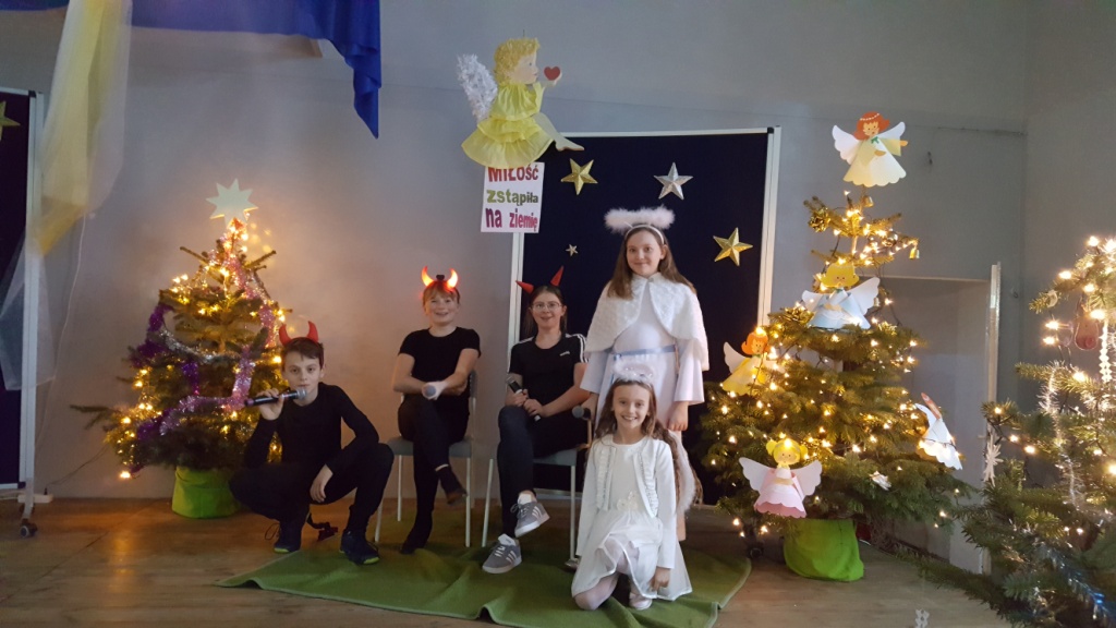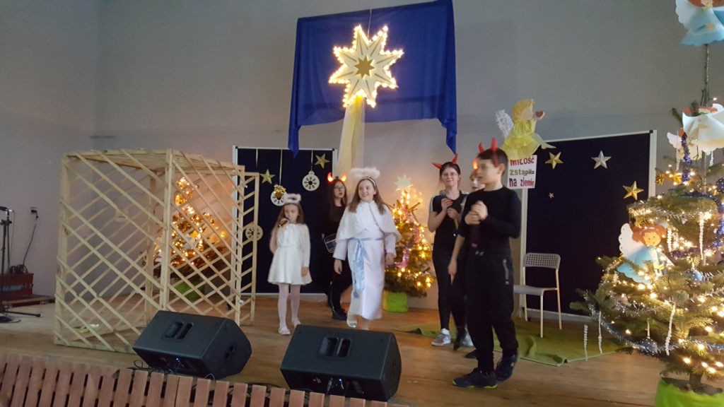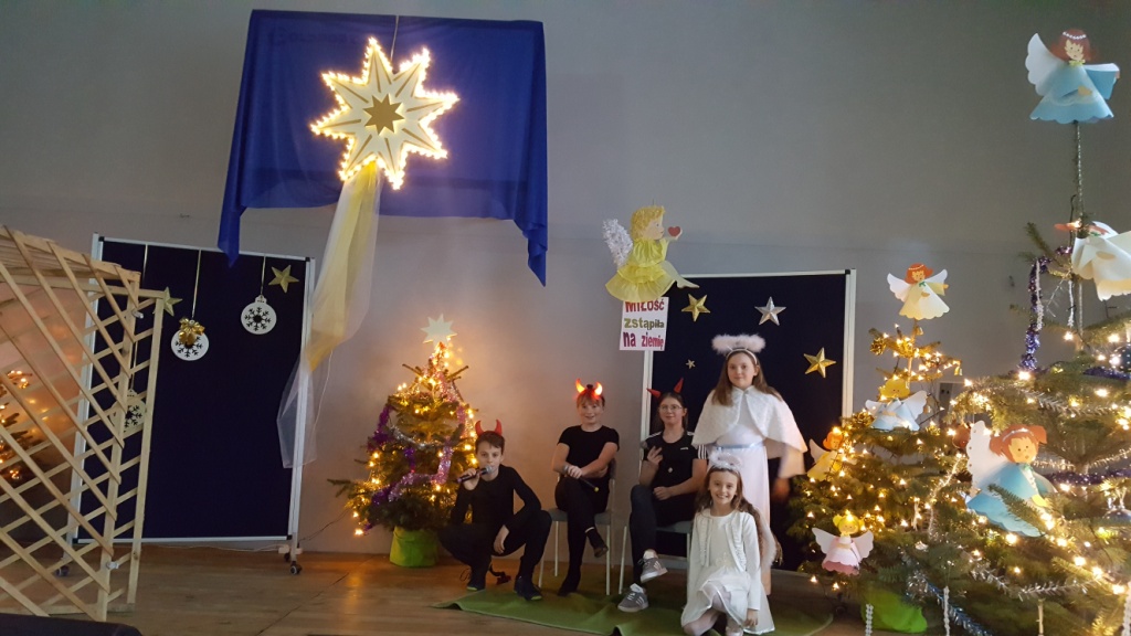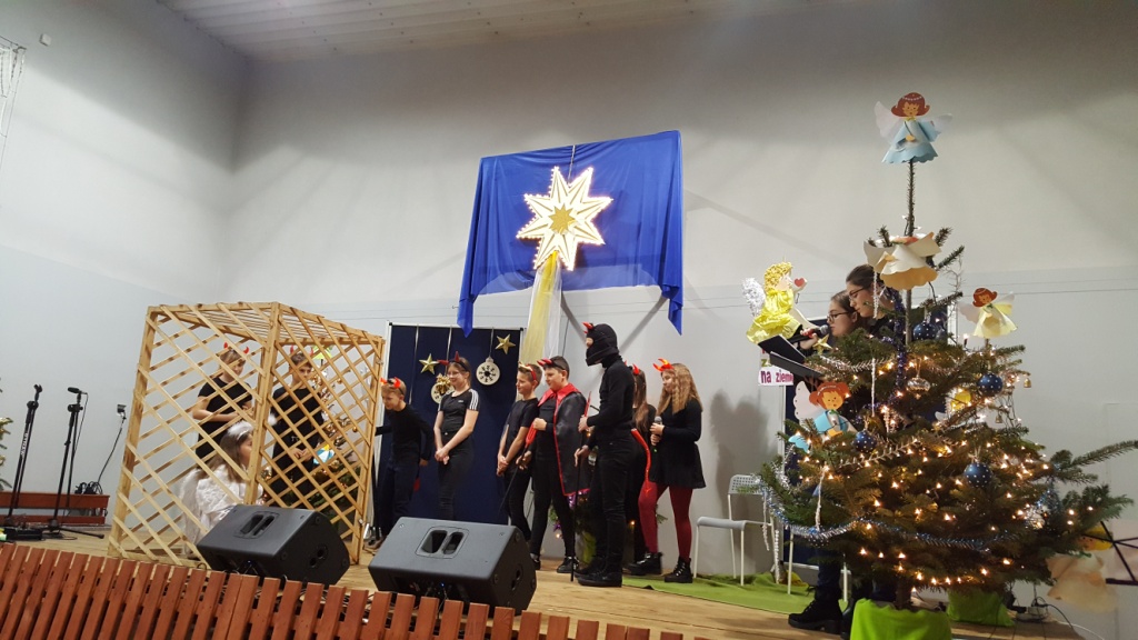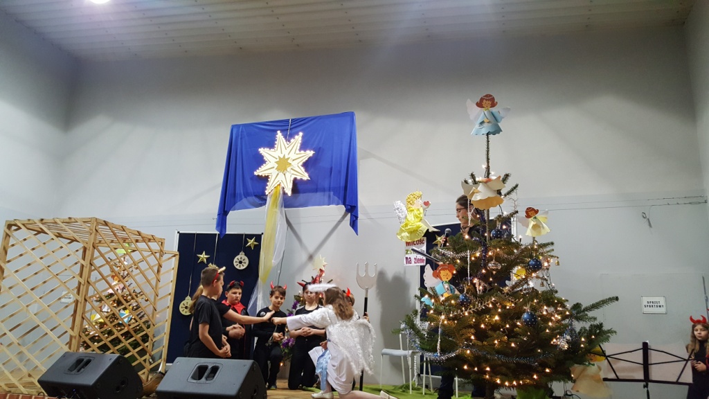 Tradycyjnie już, 6 stycznia w Hali Sportowej, odbyły się Jasełka, przygotowane przez uczniów naszej szkoły. Tematem tegorocznego przedstawienia było spotkanie aniołka, uwięzionego w klatce, z diablątkami. Aniołek podczas spotkania nauczył nowych znajomych jak się modlić, sprzątać, jak być dobrym człowiekiem - pełnym miłości, jak umieć przebaczać. Po wszystkich usłyszanych radach diablątka stały się aniołkami. Zmieniły się ich serca. Stały się dobre i piękne. Po obwieszczeniu radosnej nowiny, że Bóg narodził się w stajni, przybyli do niego pastuszek, tancerka, sportowiec, uczeń i para Murzynków. Każdy miał za co dziękować Panu Jezusowi i starał się pokazać otrzymane talenty.