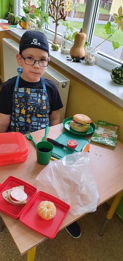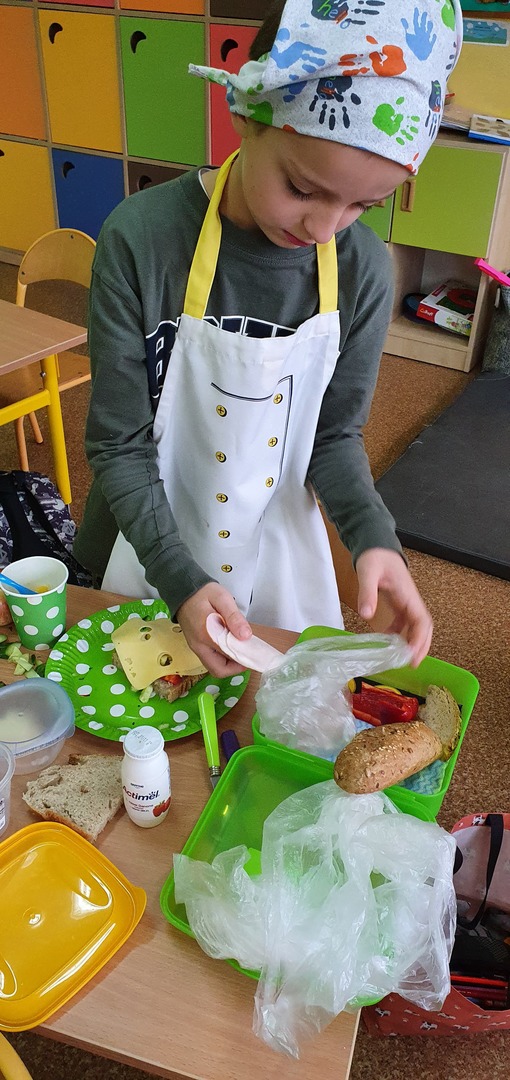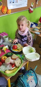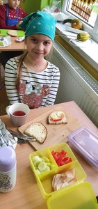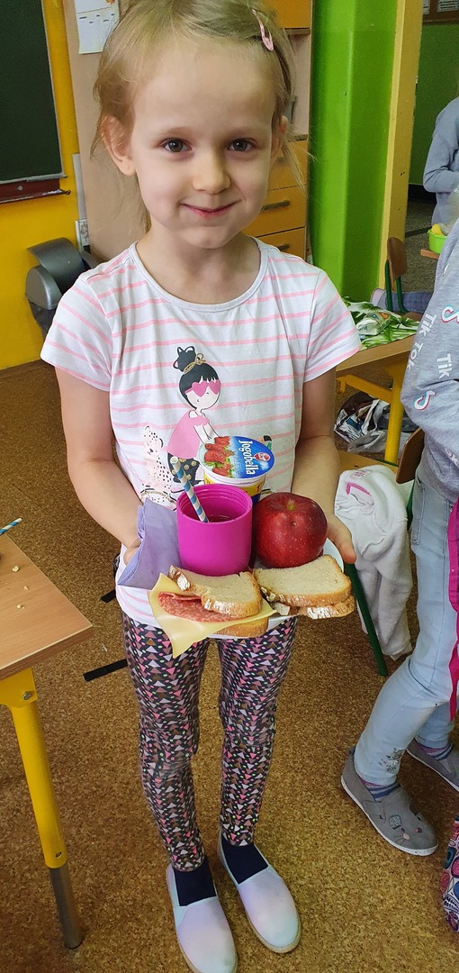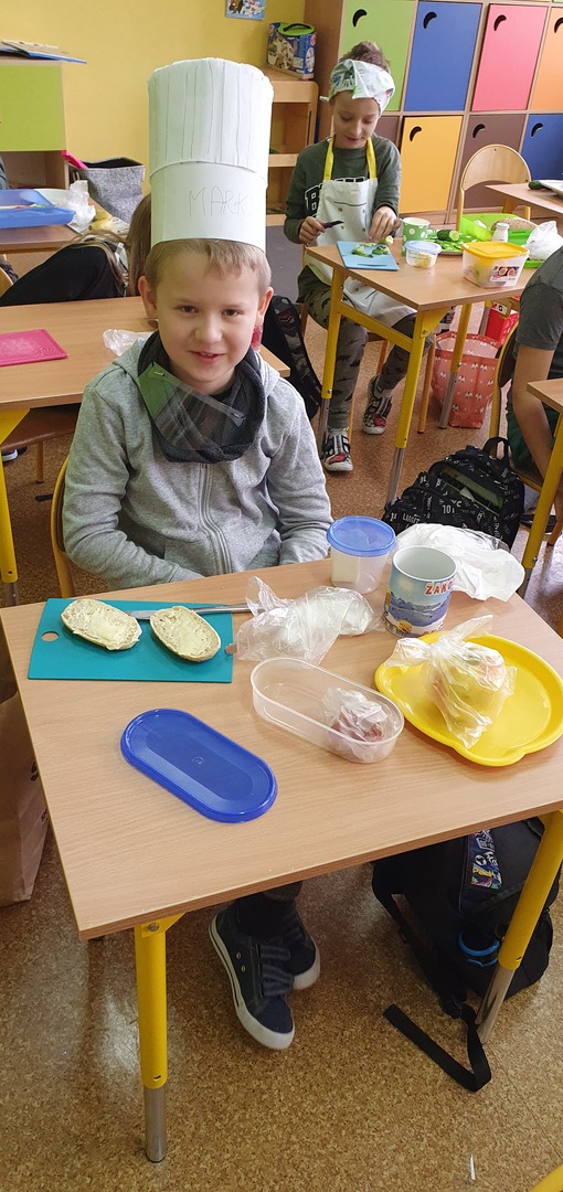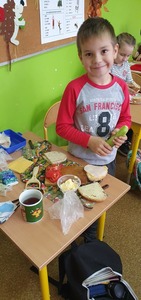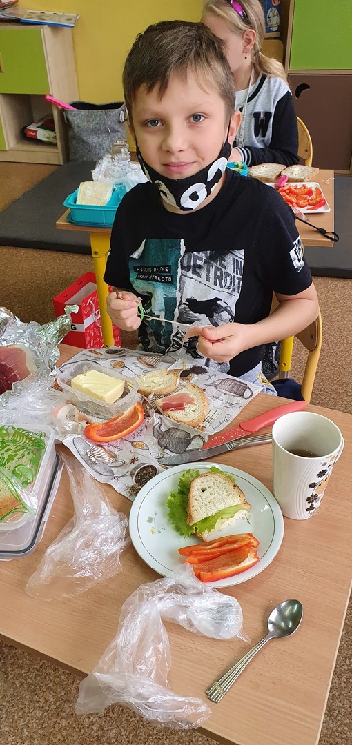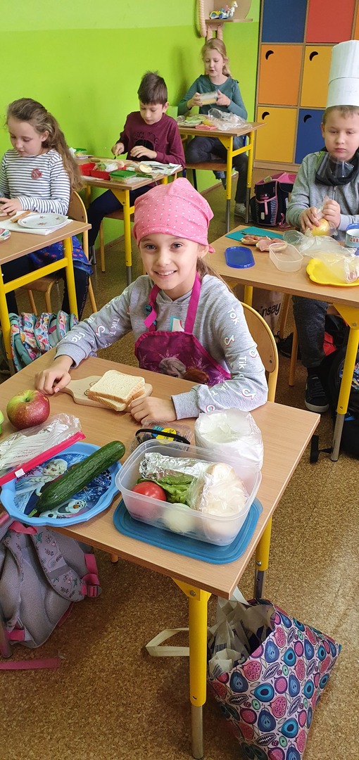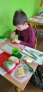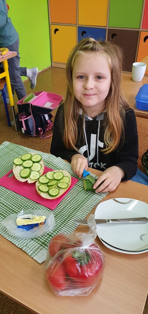 Uzupełnieniem tej akcji była prezentacja multimedialna na temat 12 zasad zdrowego odżywiania. Dzieci odpowiadały na pytania dotyczące najważniejszego posiłku dnia, wartości odżywczych produktów przygotowanych do wykonania kanapek na zajęciach. Po umyciu rąk, wspólnie zrobiły zdrowe kanapki ze zwróceniem uwagi również na ich estetykę. Była to dobra lekcja pozytywnych zachowań, a także świetna zabawa dla uczniów. Wspólne drugie śniadanie cieszyło wszystkich. Nawet sprzątanie po posiłku przebiegło sprawnie.