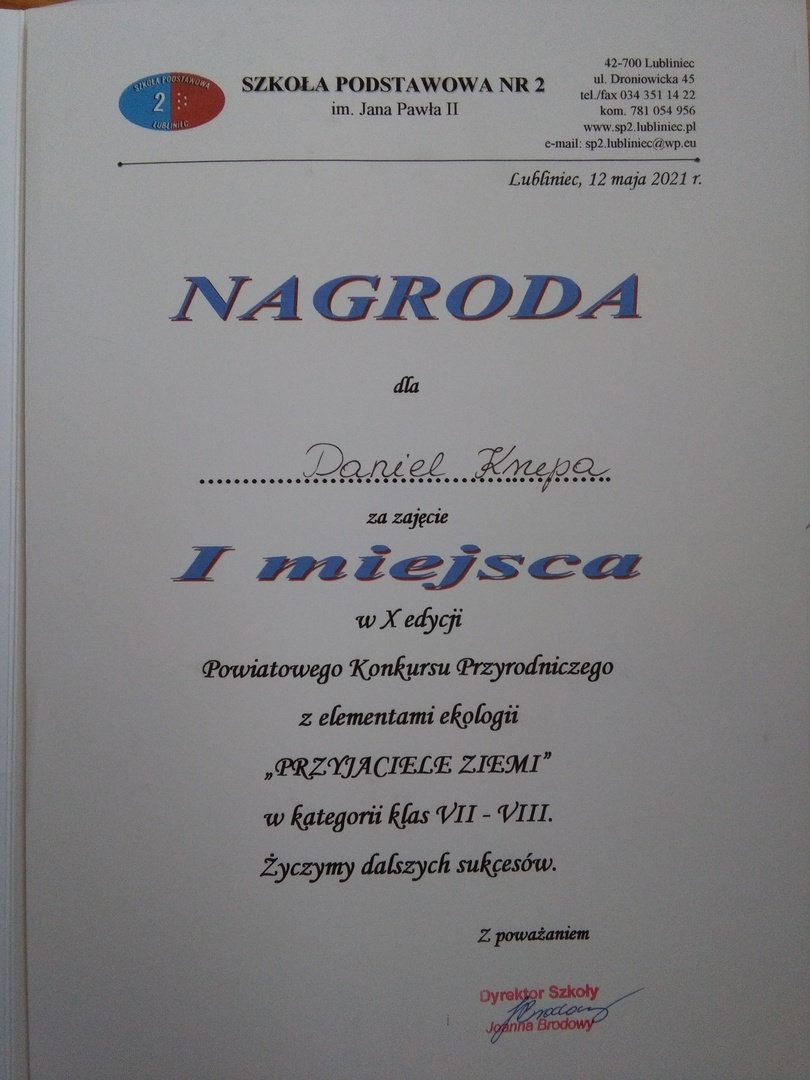 Miło nam poinformować, że Daniel Krupa odniósł sukces w X POWIATOWYM KONKURSIE PRZYRODNICZYM z elementami ekologii "Przyjaciele Ziemi" - zajął I miejsce w kategorii klas VII-VIII. Konkurs ten jest organizowany przez Szkołę Podstawową nr 2 w Lublińcu pod patronatem Burmistrza Miasta Lublińca i Nadleśnictwa Lubliniec.