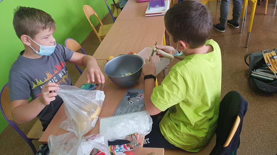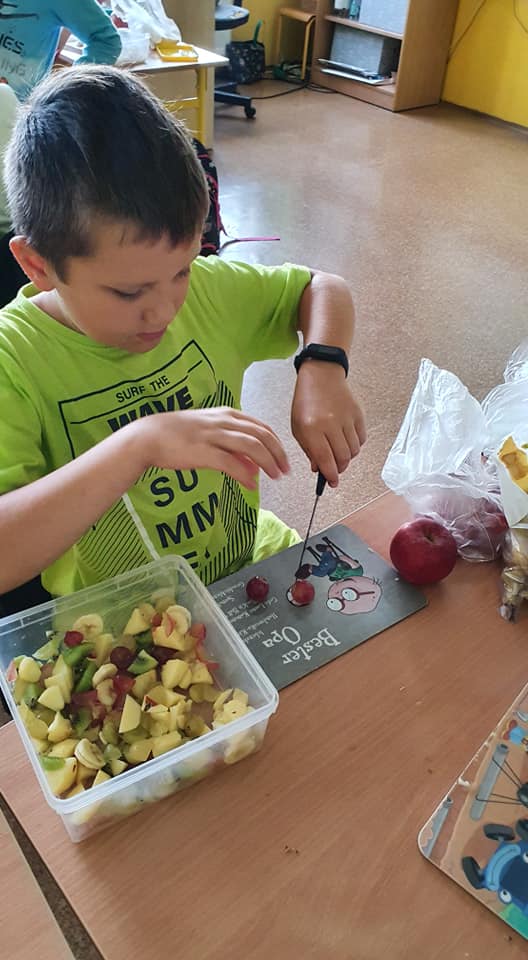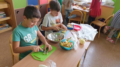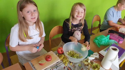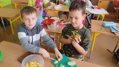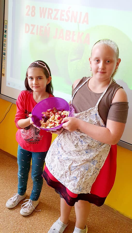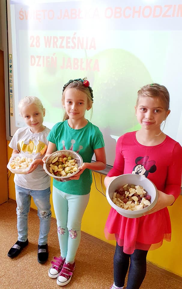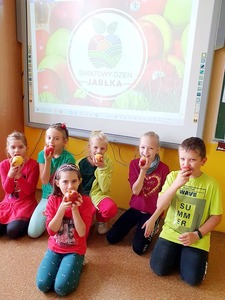 Świętowanie rozpoczęliśmy od bliższego poznania jabłka. Dzieci wysłuchały wielu ciekawostek na temat właściwości zdrowotnych tego smacznego owocu. Odważni w tym dniu przyszli do szkoły ubrani w kolorach jabłek. Uczniowie opisywali jabłko, jego wygląd, zapach i smak. Ponadto uczniowie wykonali plakaty zachęcające do spożywania jabłek. Była to też okazja, aby przypomnieć, że jedzenie warzyw i owoców jest podstawą, aby zapewnić sobie zdrowie, witalność i zminimalizować ryzyko wielu chorób. Dzieci degustowały przetwory wykonane z jabłek. Na zakończenie zajęć uczniowie wykonali pyszne owocowe sałatki z jabłkiem w roli głównej.