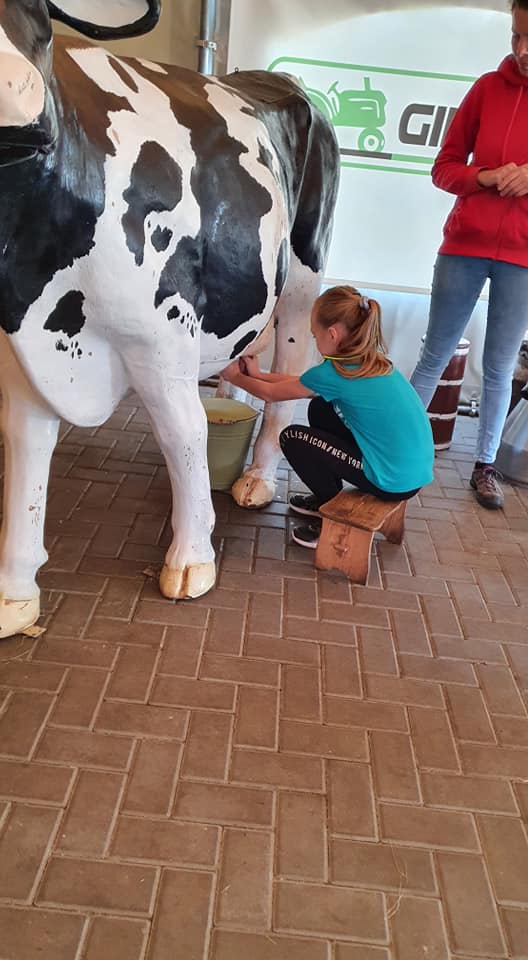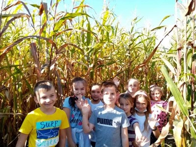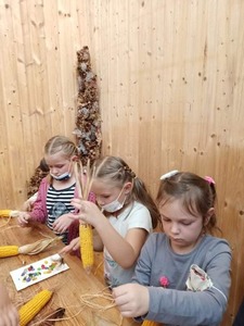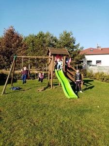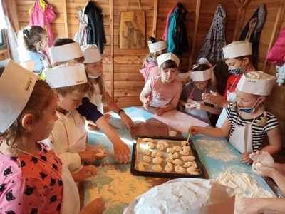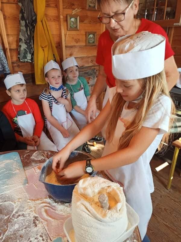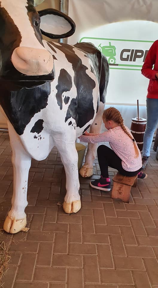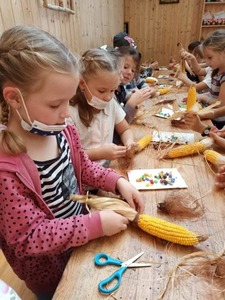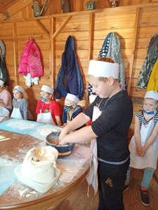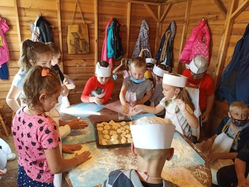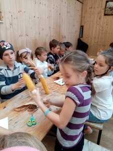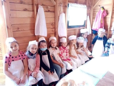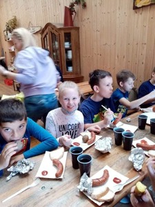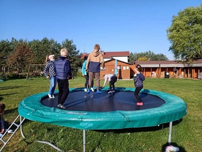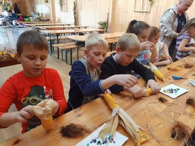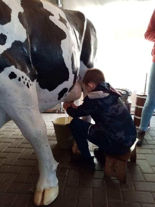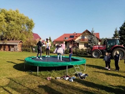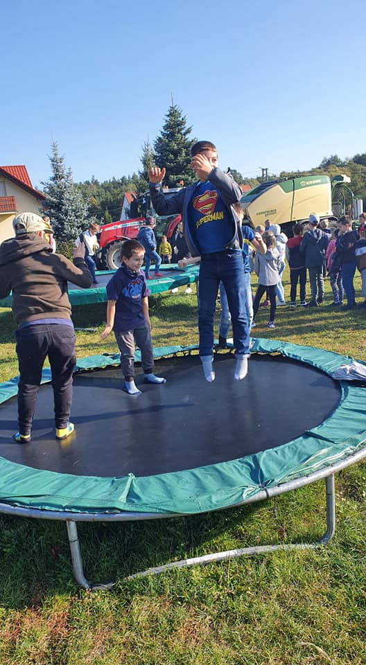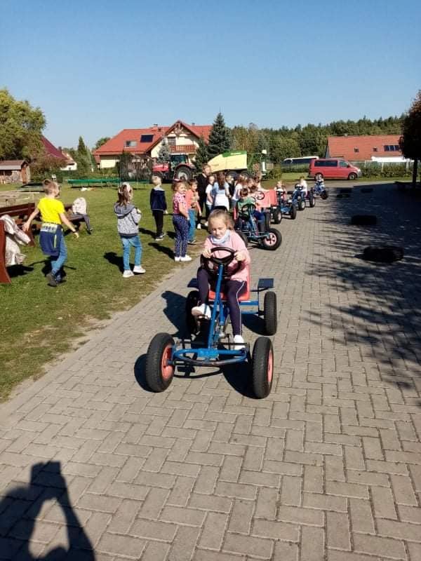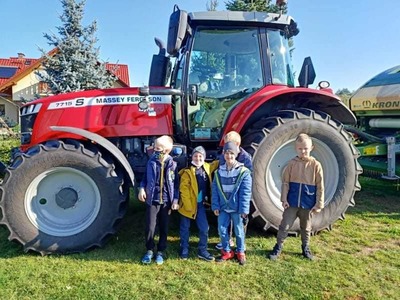 Tego dnia czekało na dzieci mnóstwo atrakcji i ciekawych zajęć edukacyjnych, które miały im przybliżyć pracę na gospodarstwie oraz ukazać uroki życia i pracy na wsi. Pierwsza atrakcja, która czekała na dzieci nosiła tytuł ,,Od ziarenka do chleba’’. Były to zajęcia w drewnianym domku z pokazem etapów powstania ciastek i pieczywa dawnymi metodami (cep, żarno). Dzieci dowiedziały się jak dawniej pracowano na roli. Następnie dzieci odpowiednio ubrane zabrały się do zarobienia ciasta na chleb, który później został upieczony i oczywiście zjedzony. Kolejnym punktem naszej wyprawy było ,, Skąd się bierze mleko? i dojenie krowy. Ze względu na bezpieczeństwo była to sztuczna krowa. Pani opowiedziała dzieciom o pozyskaniu mleka, o karmieniu krów i oczywiście o dojeniu. Każdy miał możliwość spróbowania wykonania tej czynności. Powstały fantastyczne postacie z kolb kukurydzy, zbierali również ziemniaki, które zostały upieczone w ognisku. Pod koniec tego niezwykle emocjonującego pobytu na ,,farmie" dzieci jeździły na rowerach czterokołowych, bawiły się na placu zabaw, oglądały stare maszyny rolnicze, biegały w tajemniczym labiryncie oraz delektowały się pysznymi kiełbaskami. Wycieczka przebiegła z elementami edukacji ekologicznej i zdrowotnej.