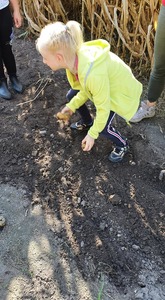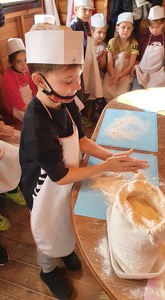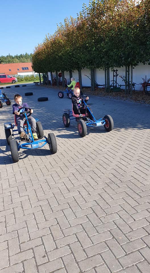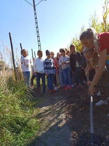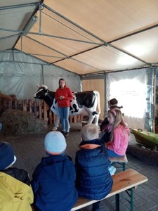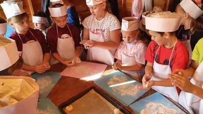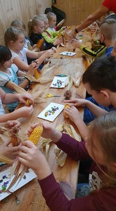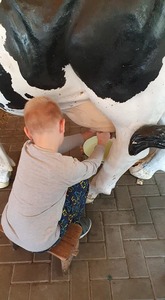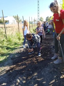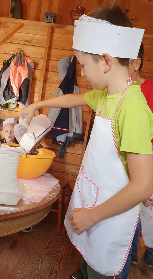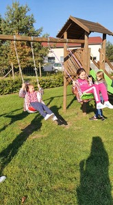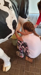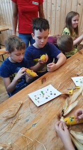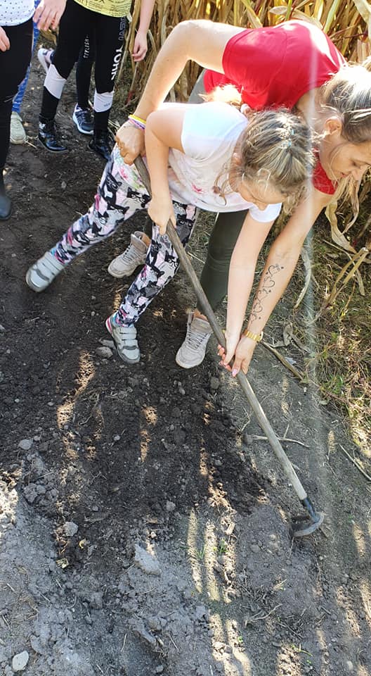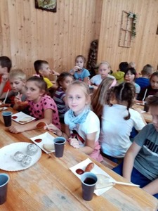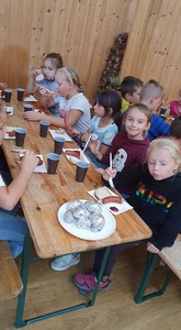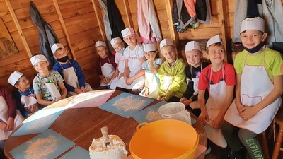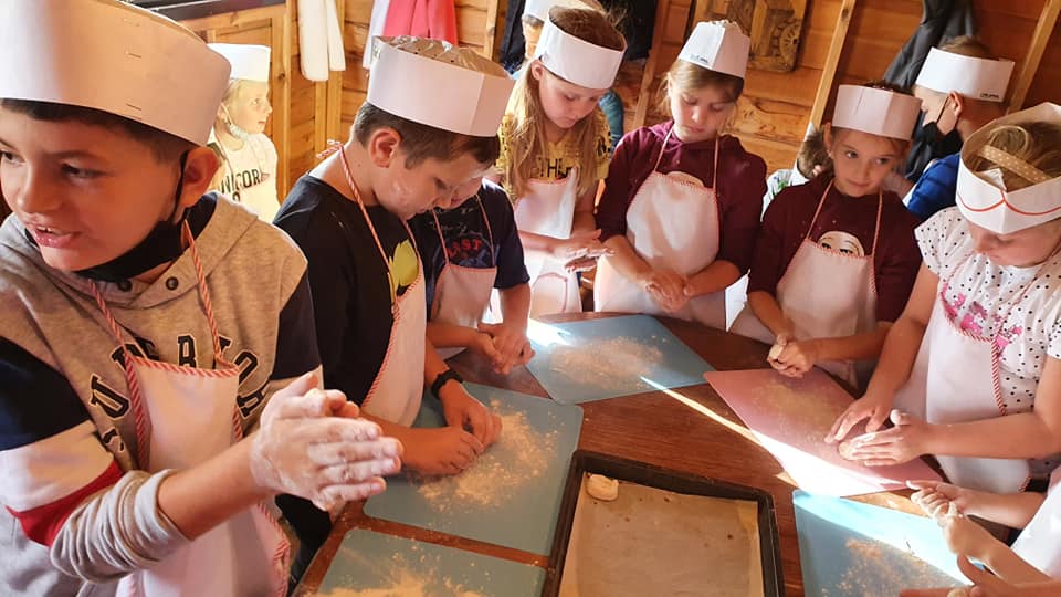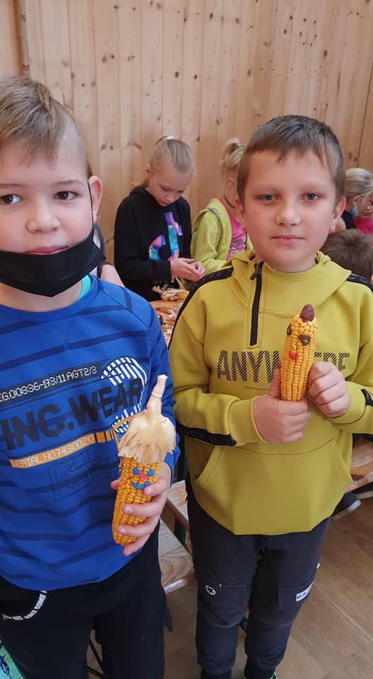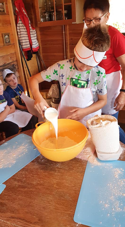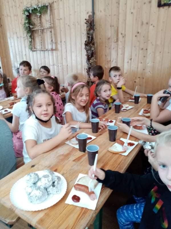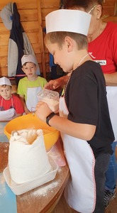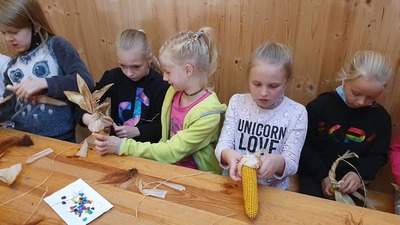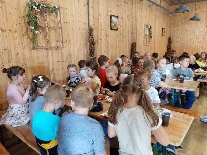 Tego dnia czekało na dzieci mnóstwo atrakcji i ciekawych zajęć edukacyjnych, które miały im przybliżyć pracę na gospodarstwie oraz ukazać uroki życia i pracy na wsi. Pierwsza atrakcja, która czekała na dzieci nosiła tytuł ,,Od ziarenka do chleba’’. Były to zajęcia w drewnianym domku z pokazem etapów powstania ciastek i pieczywa dawnymi metodami (cep, żarno). Dzieci dowiedziały się jak dawniej pracowano na roli. Następnie dzieci odpowiednio ubrane zabrały się do zarobienia ciasta na chleb, który później został upieczony i oczywiście zjedzony. Kolejnym punktem naszej wyprawy było ,, Skąd się bierze mleko? i dojenie krowy. Ze względu na bezpieczeństwo była to sztuczna krowa. Pani opowiedziała dzieciom o pozyskaniu mleka, o karmieniu krów i oczywiście o dojeniu. Każdy miał możliwość spróbowania wykonania tej czynności. Powstały fantastyczne postacie z kolb kukurydzy, zbierali również ziemniaki, które zostały upieczone w ognisku. Pod koniec tego niezwykle emocjonującego pobytu na ,,farmie" dzieci jeździły na rowerach czterokołowych, bawiły się na placu zabaw, oglądały stare maszyny rolnicze, biegały w tajemniczym labiryncie oraz delektowały się pysznymi kiełbaskami. Wycieczka przebiegła z elementami edukacji ekologicznej i zdrowotnej.