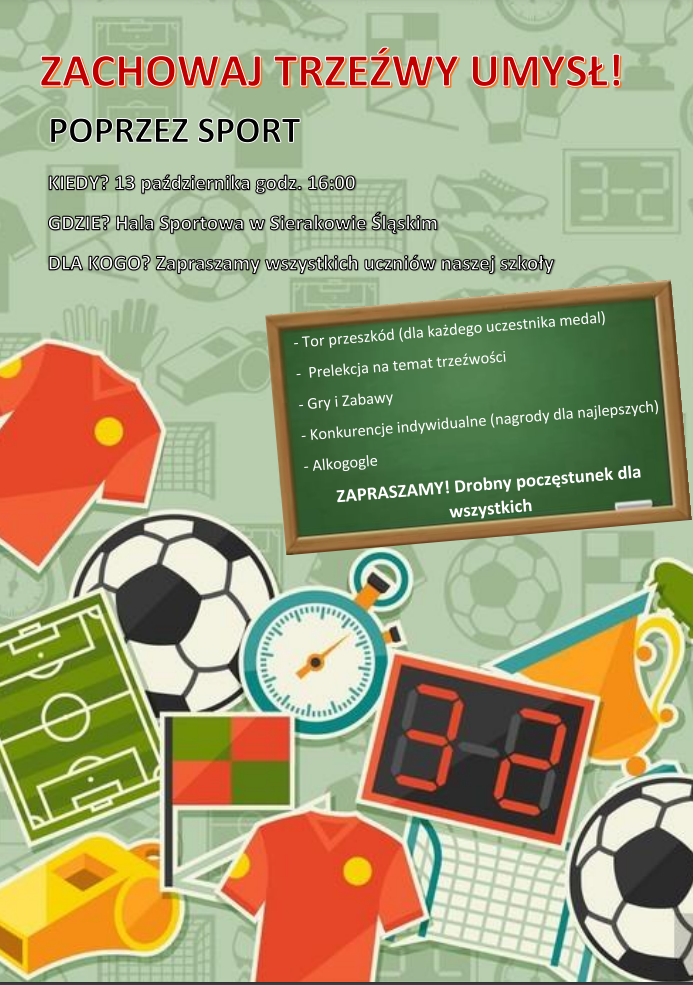 Jak zachować trzeźwy umysł? Uczestnicy imprezy sportowej, która odbyła się 13 października w hali sportowej w Sierakowie Śląskim udowodnili, że oczywiście poprzez sport. Spotkanie odbyło się w ramach realizacji projektu „Zdrowo, bo na sportowo!” realizowanego przez szkołę we współpracy z Gminnym Ośrodkiem Pomocy Społecznej w Ciasnej. Wydarzenie poprowadzili nauczyciele wychowania fizycznego i animatorzy Orlika. Na uczestników, już przy wejściu do hali czekała gazetka tematyczna związana z tematyką szkodliwości picia napojów alkoholowych. Imprezę rozpoczęła prelekcja antyalkoholowa połączona z projekcją filmu: „Krótki film o uzależnieniu”. W programie spotkania znalazł się tor przeszkód, który wzbudził wśród uczniów ogromne sportowe emocje, konkursy zręcznościowe, gry i zabawy integrujące społeczność. Przygotowano również konkurencję sprawnościową z wykorzystaniem alkogogli, które symulują stan nietrzeźwości zaburzając pracę błędnika i otępiając zmysł wzroku. Alkogogle miały za zadanie pokazywać niebezpieczeństwo i ryzyko poruszania się pod wpływem alkoholu. Uczniowie wychodzili z imprezy z medalami na piersiach i pucharami, bo wszyscy, którzy aktywnie spędzili ten popołudniowy zasłużyli na wyróżnienie. Poza tym wiadomo: „Zdrowo, bo na sportowo”.