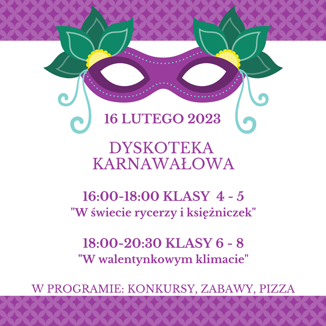 Dyskoteka karnawałowa Zdjęcia Zobacz również Zapraszamy do udziału w Międzypowiatowym Konkursie... Nocne marki z 7 klasy - to my! Walentynki w szkole - informacje Dyskoteka karnawałowa KONKURS "Poznajemy Parki Krajobrazowe Polski"... Konkurs matematyczny 06 lutego 2023 Aktualności Wydrukuj Udostępnij Wyświetlono: 242
