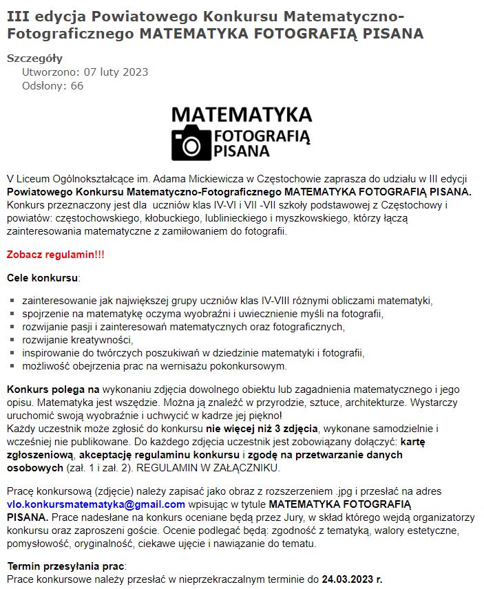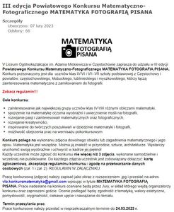 Konkurs matematyczny Zachecamy do udziału w konkursie. Szczegóły na stronie https://www.vmickiewicz.pl/3564-iii-edycja-powiatowego-konkursu-matematyczno-fotograficznego-matematyka-fotografia-pisana Zdjęcia Zobacz również Walentynki w szkole - informacje Dyskoteka karnawałowa KONKURS "Poznajemy Parki Krajobrazowe Polski"... Konkurs matematyczny Szkolne walentynki Dyskoteka karnawałowa IV-VIII 12 lutego 2023 Aktualności Wydrukuj Udostępnij Wyświetlono: 181