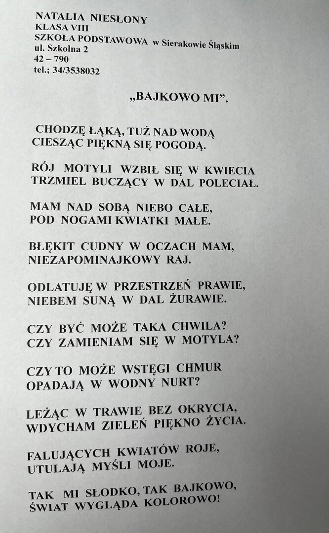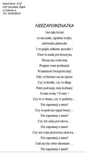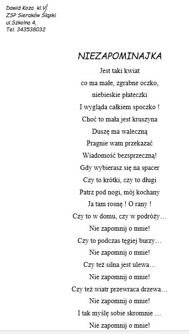 Każdy z uczniów napisał wiersz zgodnie z tematem konkursu. Jak widać twórczość Natalii i Dawida bardzo zaciekawiła jury. Ich twórczość przedstawiamy w załącznikach.