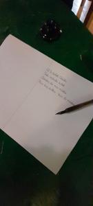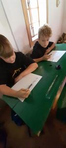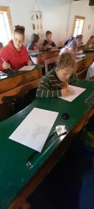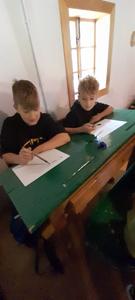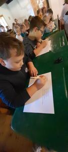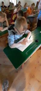 Na zakończenie warsztatów uczniowie próbowali pisać rysikiem po tabliczkach łupkowych, co – jak się okazało – wymagało dużej precyzji i cierpliwości. Jeszcze trudniejsze okazało się pisanie stalówką maczaną w atramencie – większość z uczestników zmagała się z nieuniknionymi kleksami i ciemnymi plamami na dłoniach.