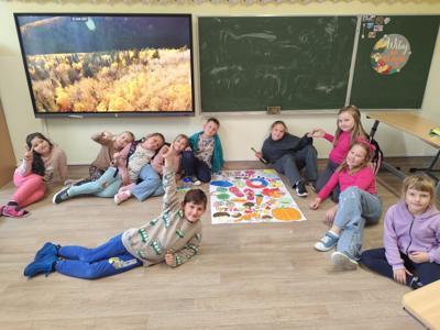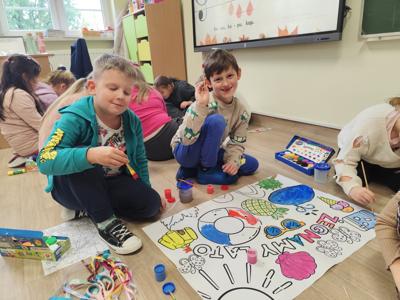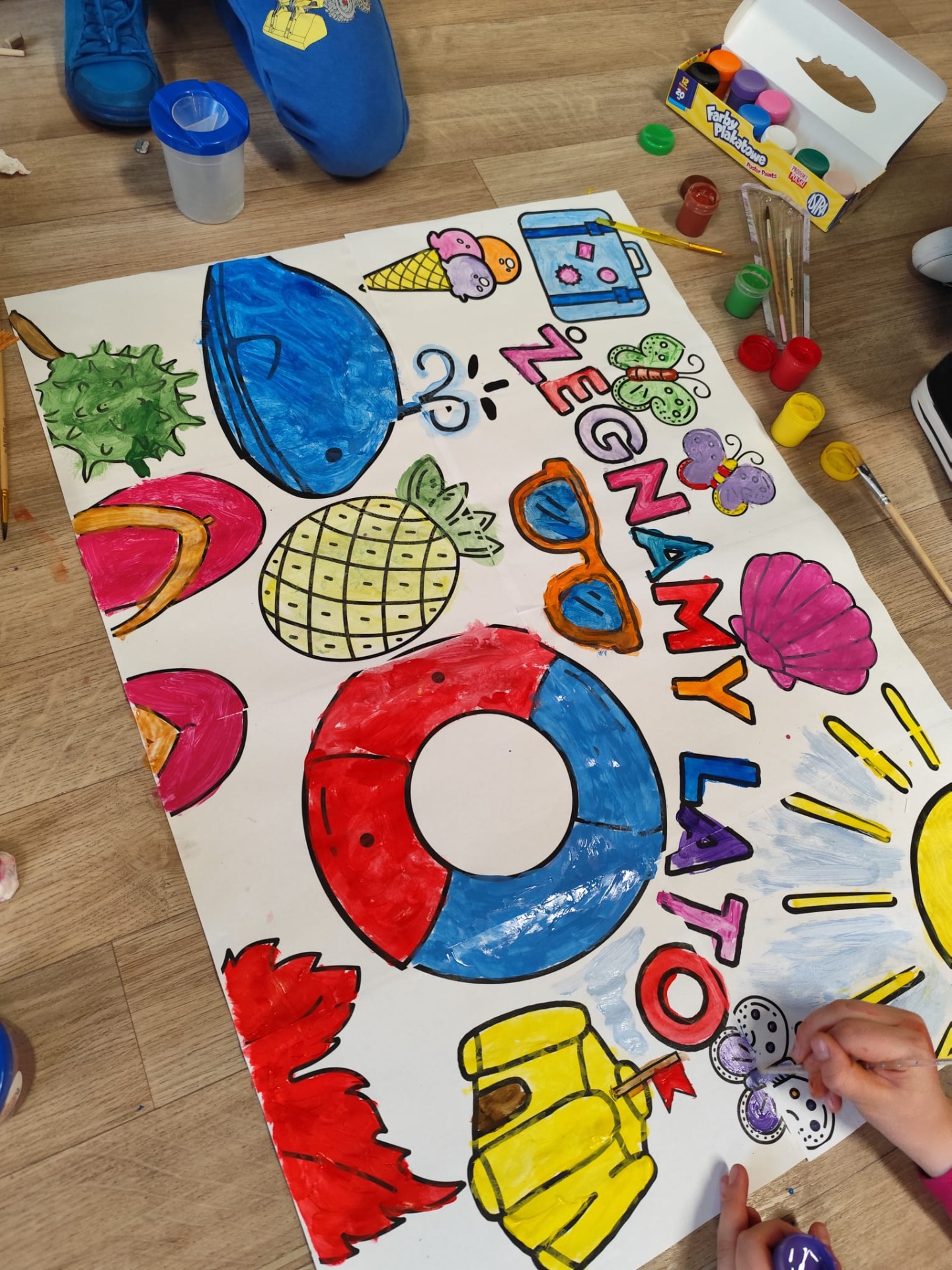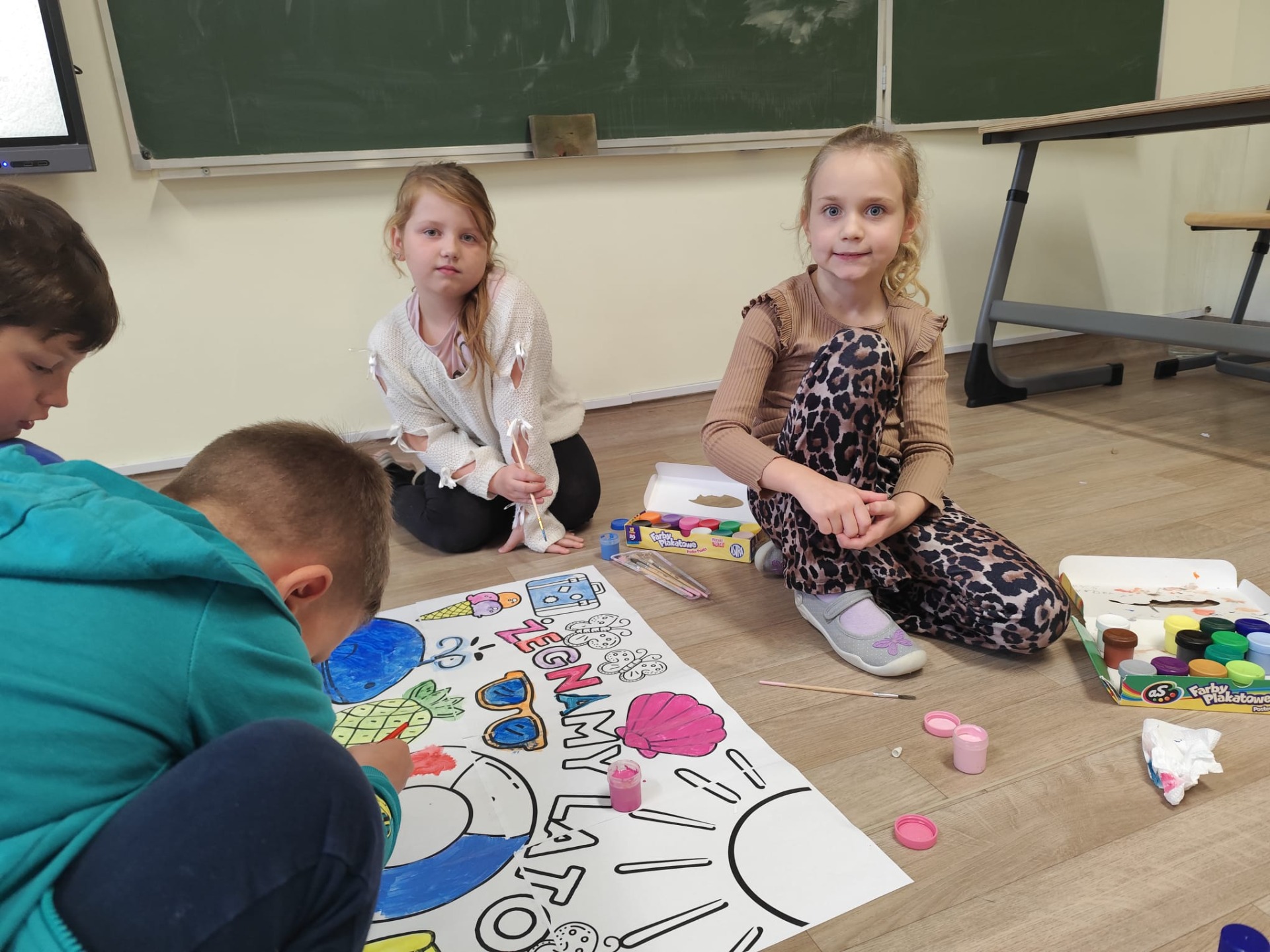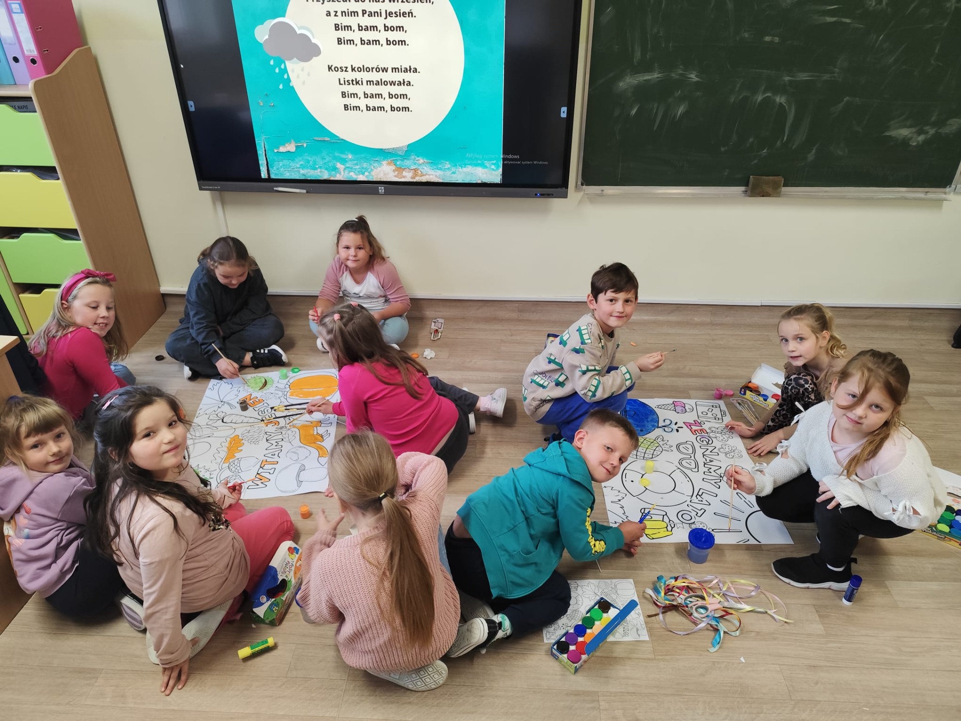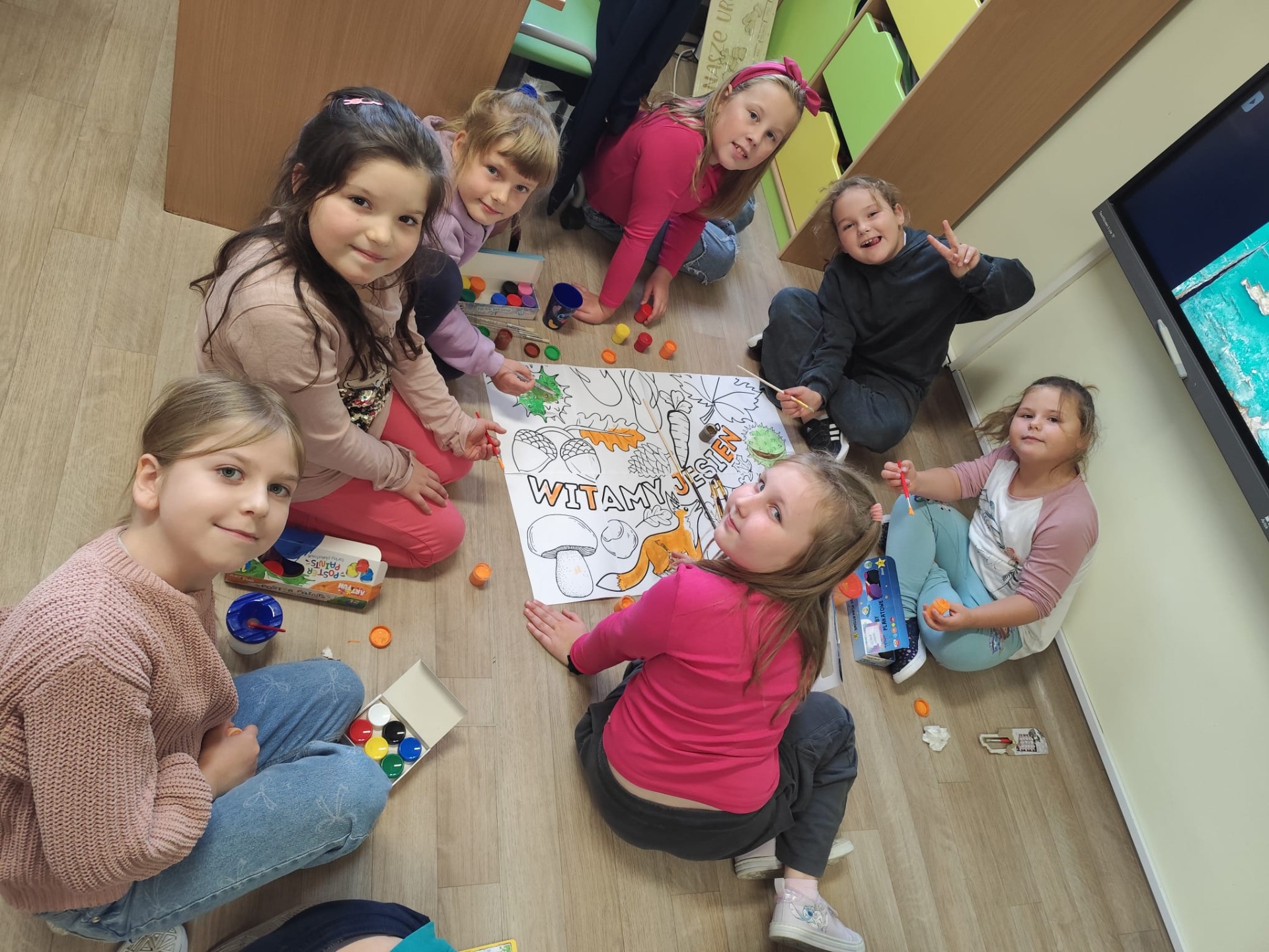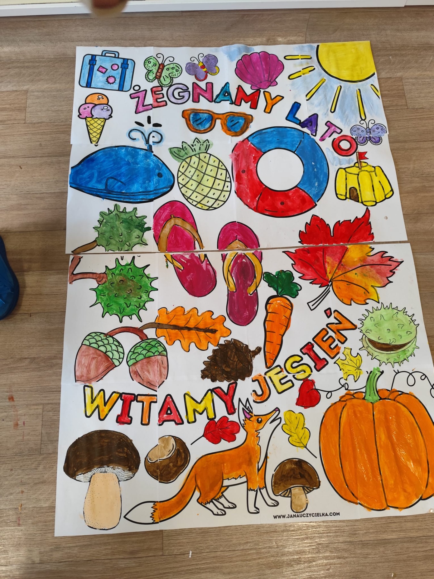 Dzieci z ogromnym zaangażowaniem stworzyły również plakat XXL z hasłem „Lato żegnamy, jesień witamy”, który ozdobił szkolny korytarz i wprowadził wszystkich w jesienny nastrój.