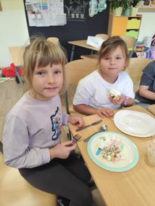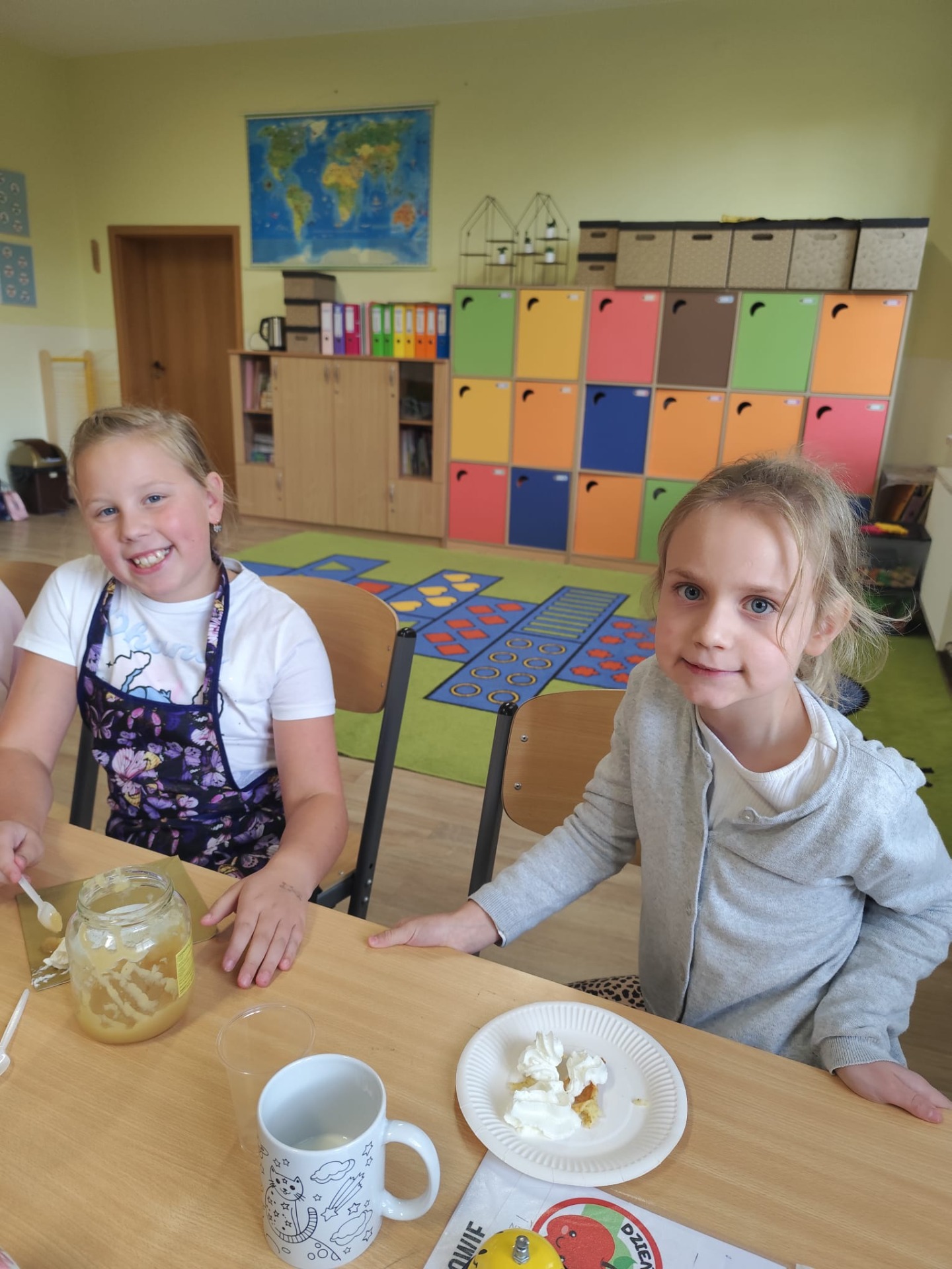 Z okazji „Dnia Jabłka” uczniowie zamienili się w małych kucharzy! Własnoręcznie przygotowali pyszne jabłkowe placuszki, ucząc się przy tym odmierzania składników, mieszania ciasta i przestrzegania zasad bezpieczeństwa w kuchni. Na koniec oczywiście nie zabrakło degustacji – z dodatkiem miodu, cukru pudru i cynamonu! Zapach i smak domowych placuszków sprawił, że w sali zapanowała prawdziwie rodzinna atmosfera.