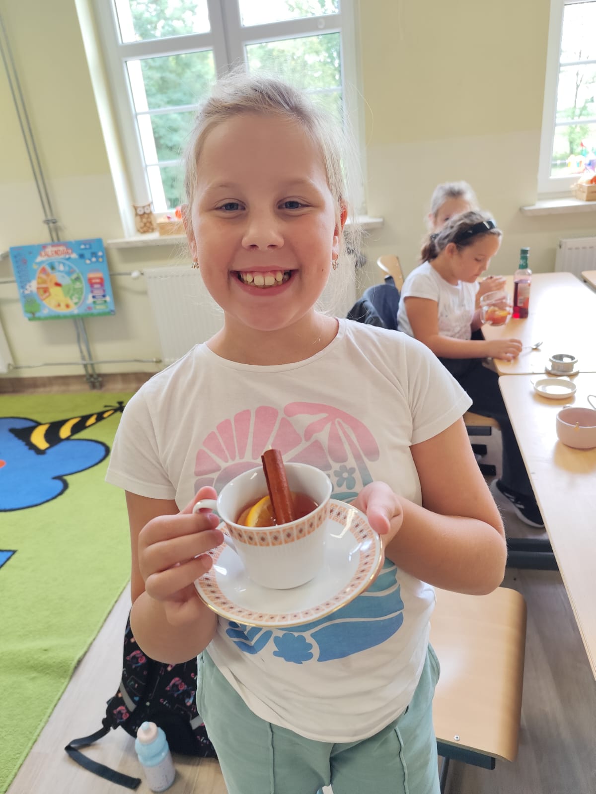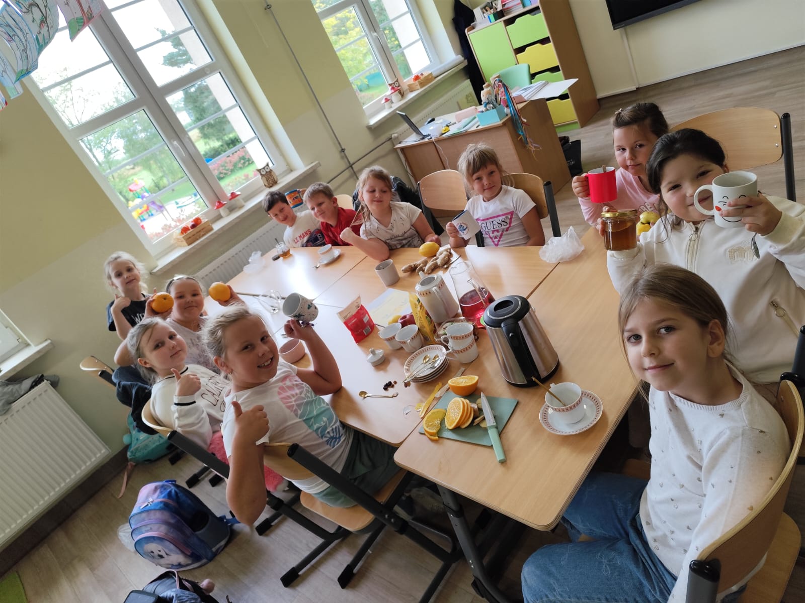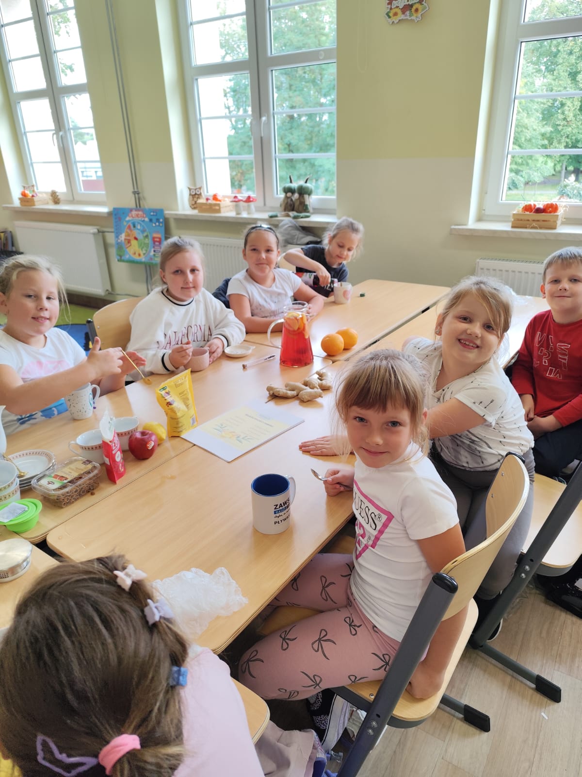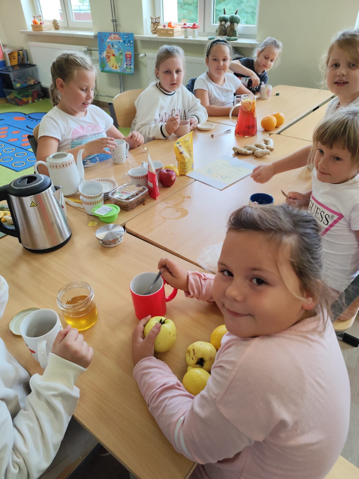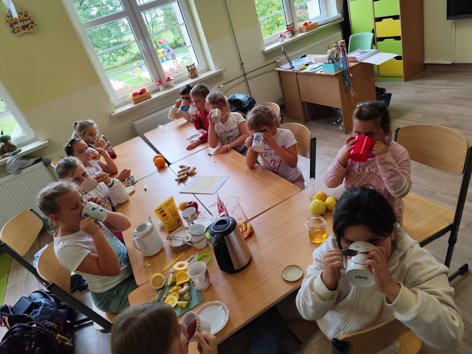 Na rozpoczęcie kalendarzowej jesieni uczniowie przygotowali rozgrzewającą herbatkę zimową z imbirem, pigwą, suszoną żurawiną, rodzynkami, cytryną i miodem. Wspólne parzenie aromatycznego napoju było doskonałą okazją, by porozmawiać o zdrowych, naturalnych sposobach wzmacniania odporności.