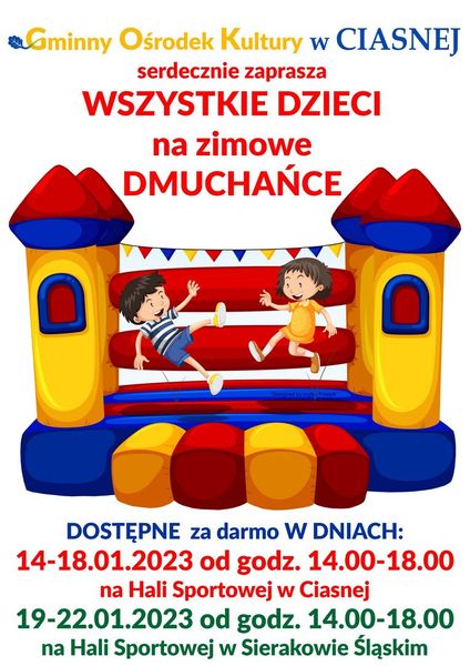 03 stycznia 2023 Aktualności Zimowe dmuchańce Gminny Ośrodek Kultury w Ciasnej serdecznie zaprasza wszystkie Dzieci na zimowe dmuchańce. Czytaj więcej